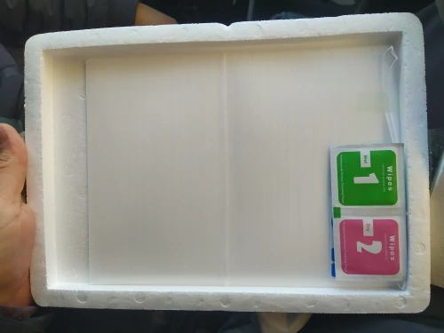 Товар упакован качественно, в пенопластовый пенал. прилагается тюбик с жидкостью для заполнения пузырьков и салфетки. Само стекло еще не клеил, по размерам соответствует.