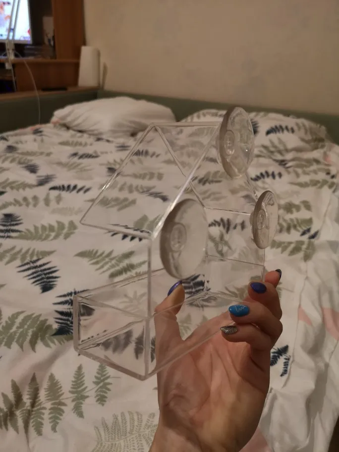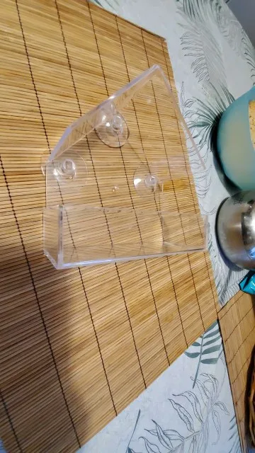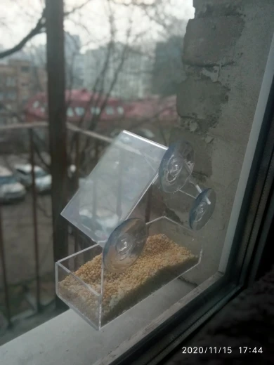 Небольшая кормушка, как раз для воробьев или синичек. Легкая пришла целой. Присоски в целом неплохие, но лучше крепить ее на стекло до начала морозов, иначе может отваливаться.
