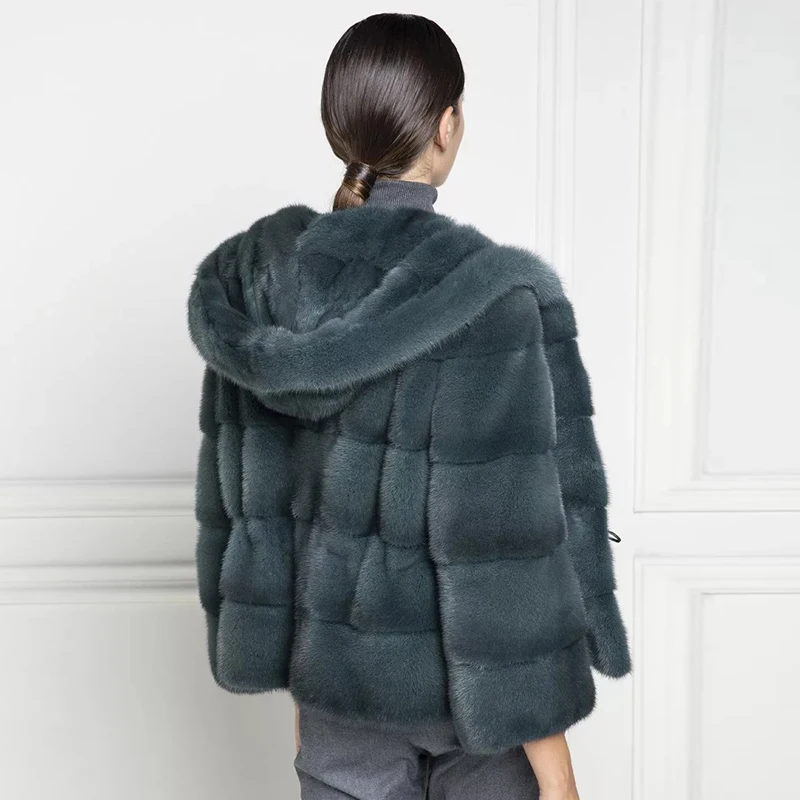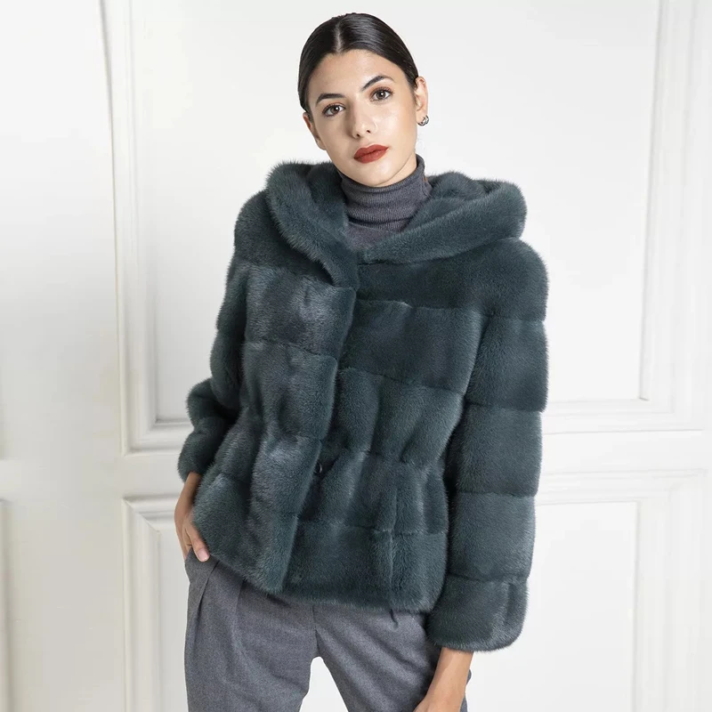 Шуба женская из натурального меха норки, короткая, с капюшоном, цельная кожа, русская зима