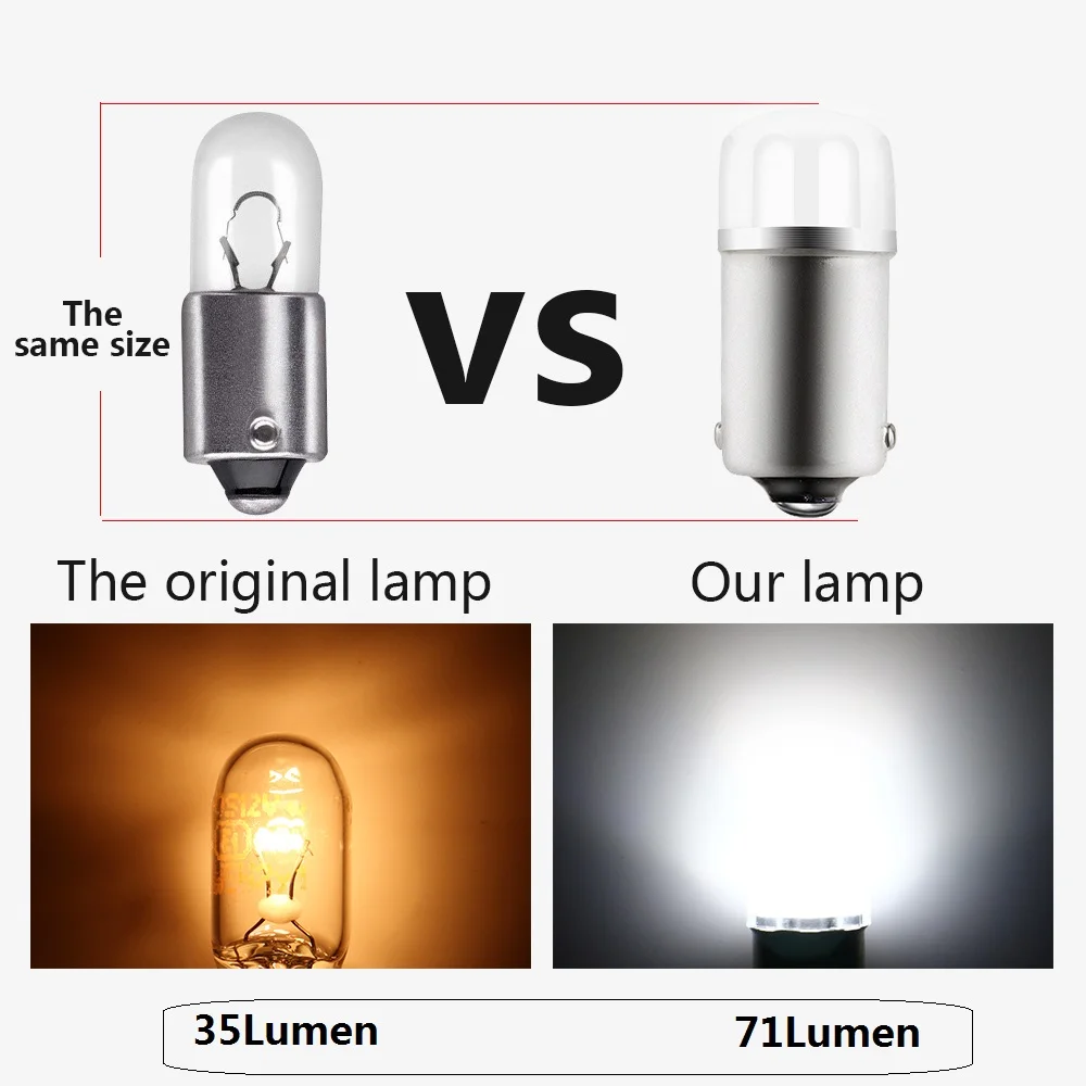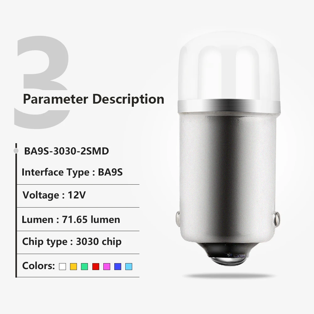 * Основание лампы: стандарт BA9S * Светодиодный комплект микросхем: 3030 SMD * Угол луча: 180 градусов * Выход освещения: около 70 люмен * Рабочее напряжение: 12 В постоянного тока * Светодиодный Цвет: белый * Цветовая температура: 8000K * Срок службы: 20000 рабочих часов * Стандарты и сертификаты: CE/ROHS Посылка включает в себя: 10 шт BA9S 3030 светодиодный свет