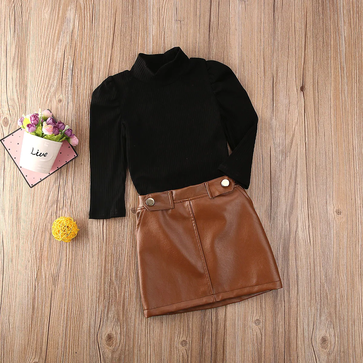 От 1 до 5 лет, модные комплекты одежды для маленьких девочек свитер с высоким воротником Топы + кожаная юбка, комплект одежды из 2 предметов