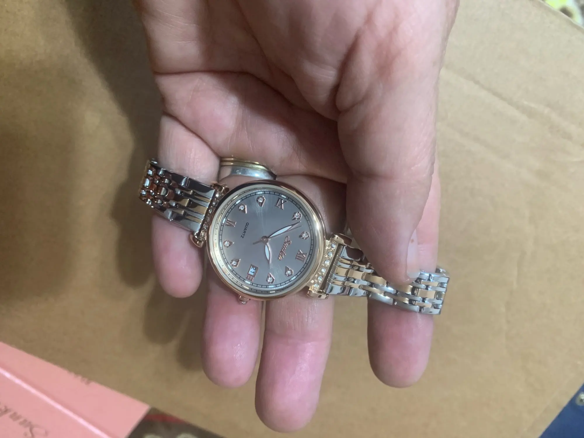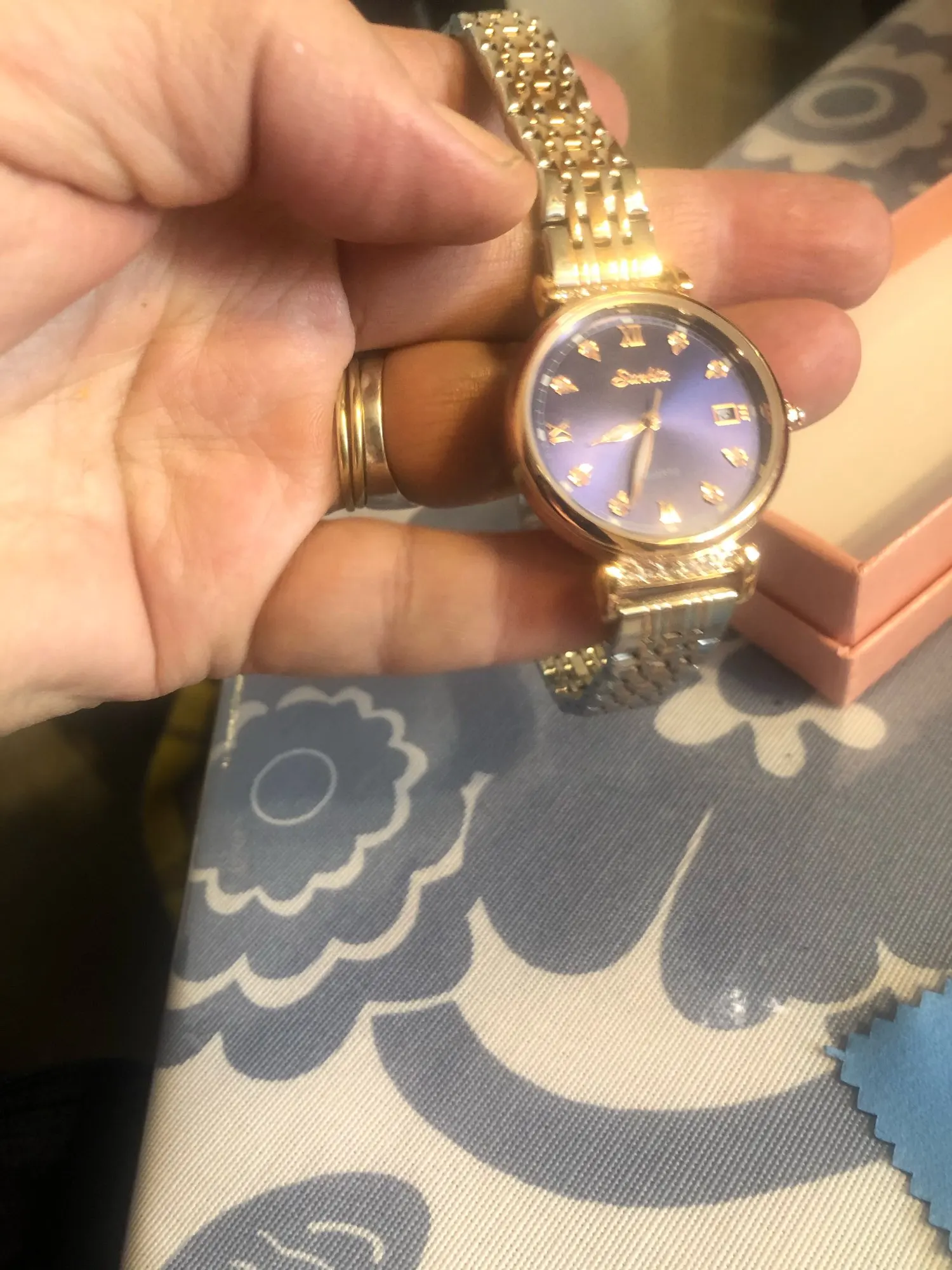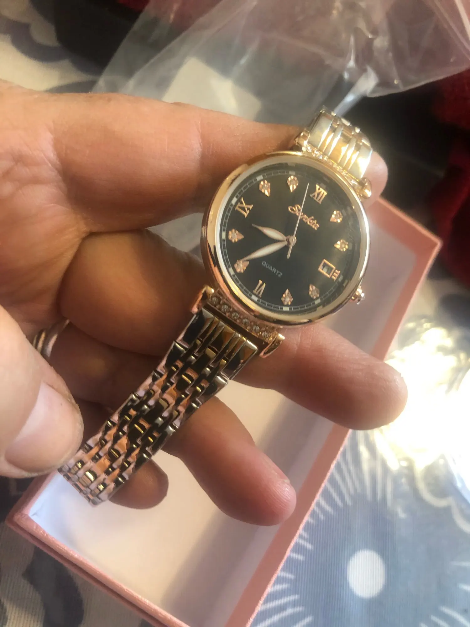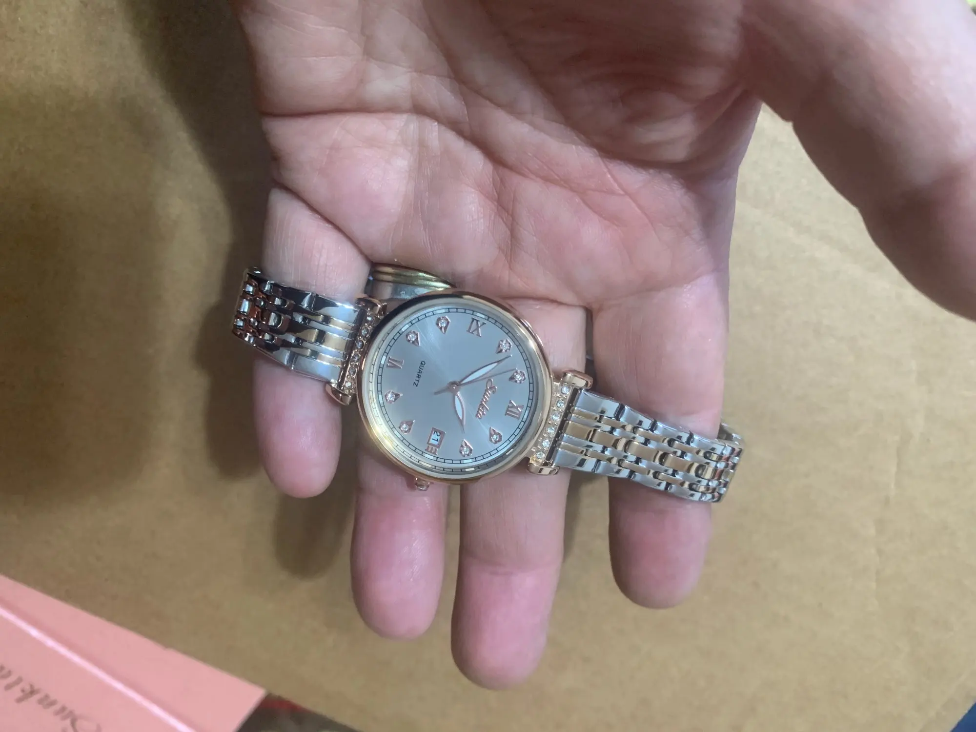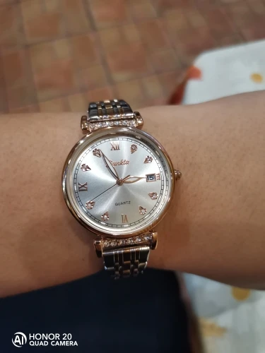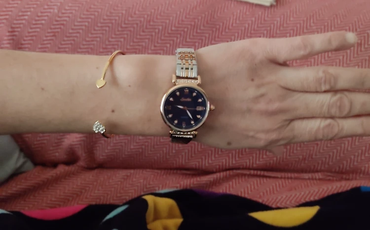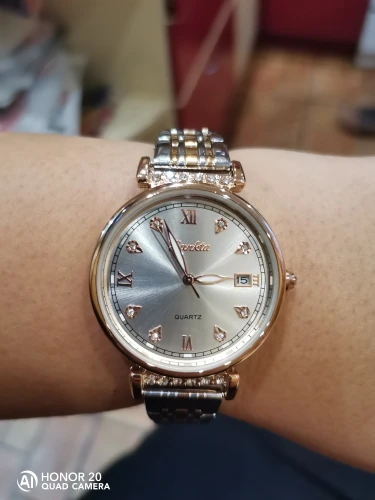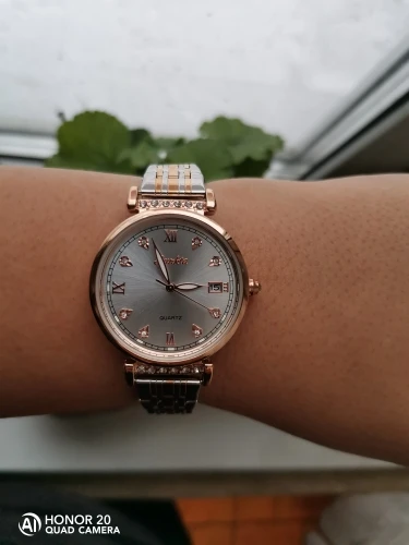 Весьма красивые часы. Среднего веса, что понравилось. Упакованы в коробочку красивую, и браслетик милый. Спасибо большое. Пришло быстро! Браслет большой, но звенья убираются. Как будет в носке не знаю, надеюсь сильно быстро не облезет покрытие. Спасибо производителю и продавцу!!
