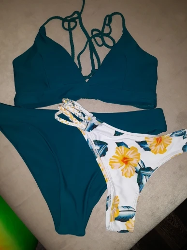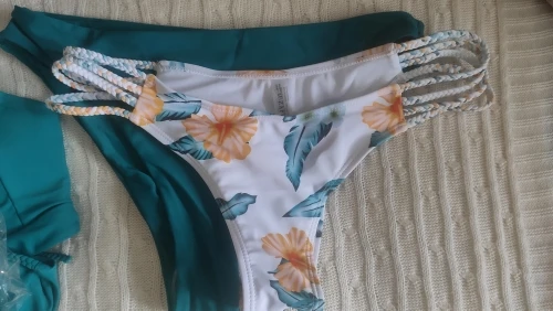 Красивый купальник, красивый цвет, белые трусики поменьше и мне маловаты, размер м на ОБ 98 подходит! Грудь смотрится красиво, размер можно отрегулировать шнурком, затягивается как корсет! Достойный купальник, носить буду!