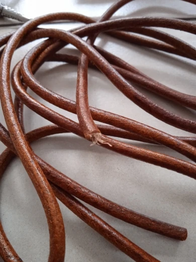 Шнур, судя по запаху, действительно кожаный. Пропитан чем-то или покрашен, отчего довольно жёсткий. Шнур не сплошной, склейка заусовкой. Места склейки найти непросто, но они есть. У меня в таком месте он порвался. Честно говоря, я ожидал шнур из обыкновенной кожи. Этот же создаёт впечатление полимерности.