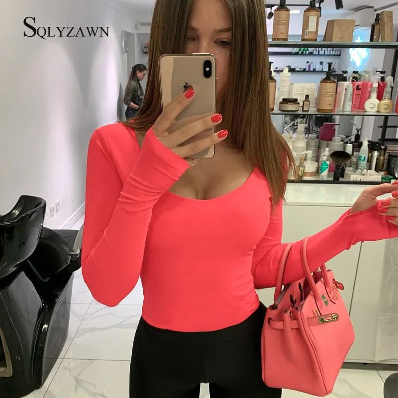 Оранжевый неоновый боди для женщин с длинными рукавами и открытыми плечами облегающее сексуальное 2019 на осень и зиму, уличная Клубные Вечерние наряды Повседневная Женская одежда