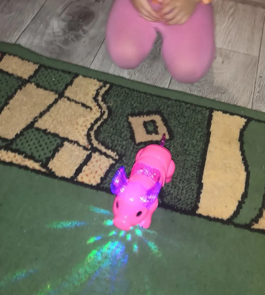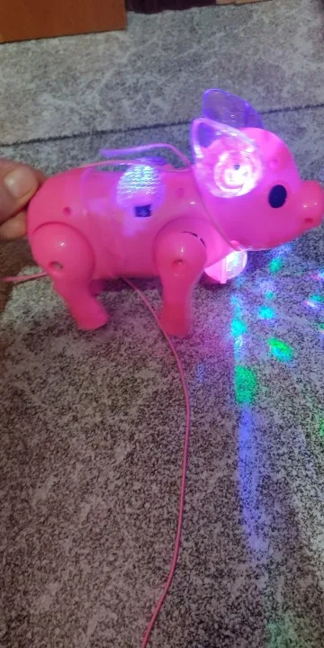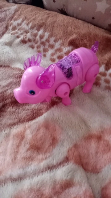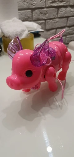 свинья сама по себе хорошая,все работает,бегает,светится,шустрая. Но есть одно "но" - ужасно громкая музыка,просто неприятная даже взрослым, не говоря уже про ребенка, наш ребёнок испугался именно музыки,начал плакать и теперь как видит эту свинью,то убегает от неё (ребенку 1 год и 3 месяца). Дадим намного позже эту игрушку, когда станет старше. Но, ещё раз повторюсь, музыка ужасная, даже взрослым, имейте это в виду, когда будете покупать. Куда такую громкость? Непонятно.
