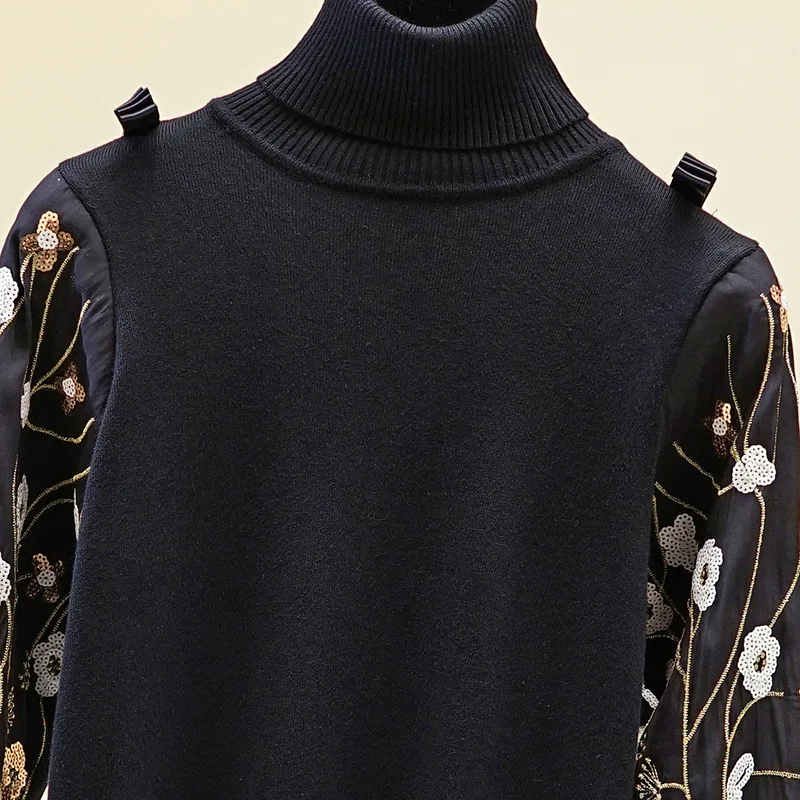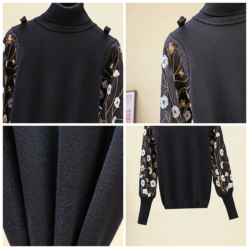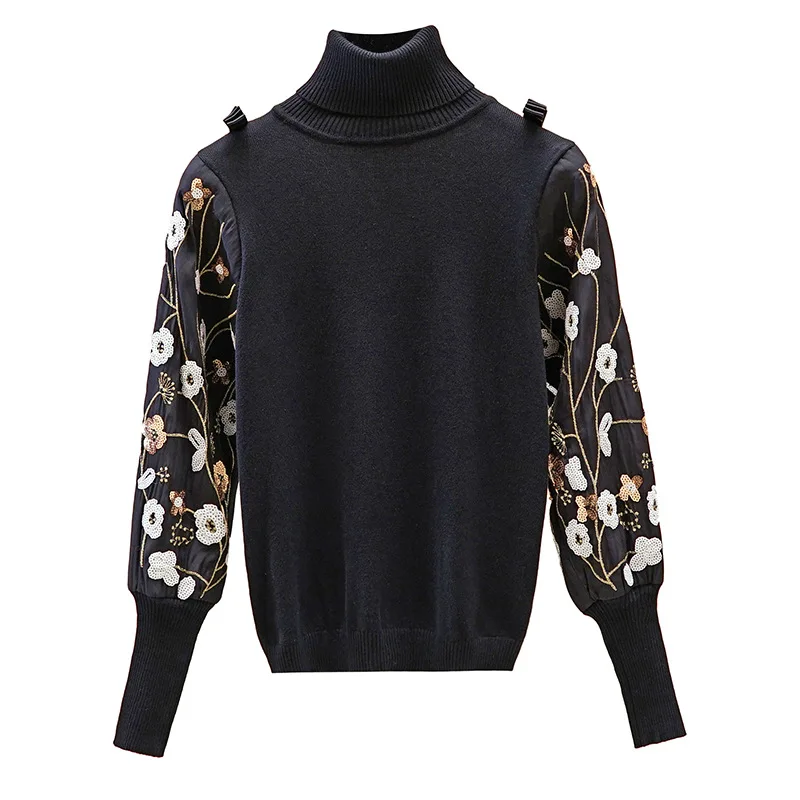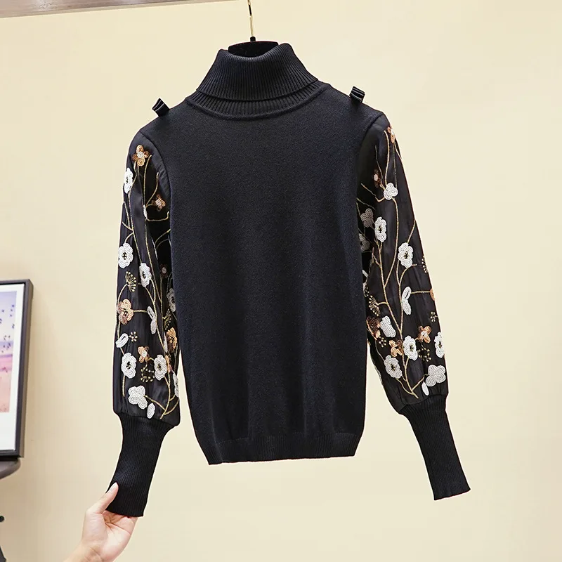 HLBCBG высококачественный Женский свитер с высоким воротником роскошный пуловер с вышивкой и блестками топы шикарный вязаный свитер с бантом женский черный
