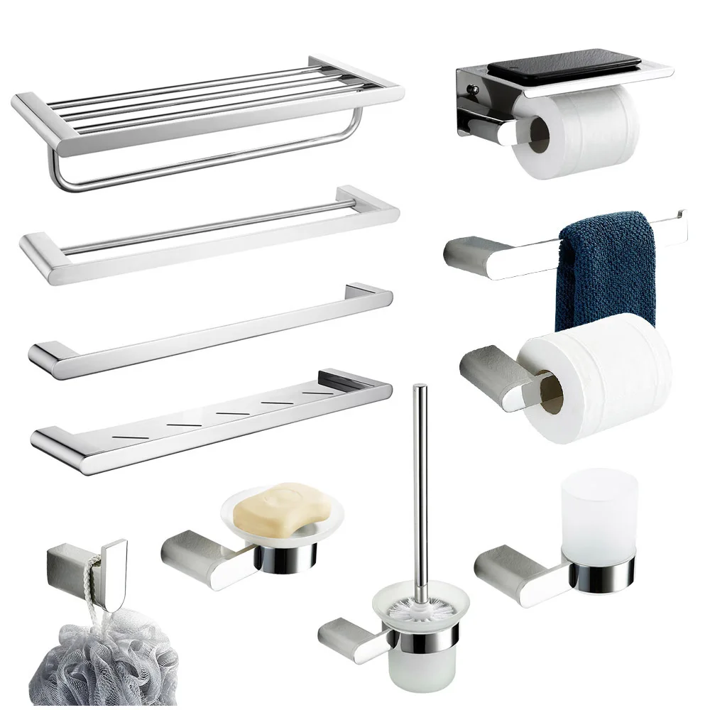 Зеркальные хромированные аксессуары для ванной комнаты, набор принадлежностей, вешалка для полотенец, держатель для бумаги, крючок для халата, мыльница, ершик для туалета