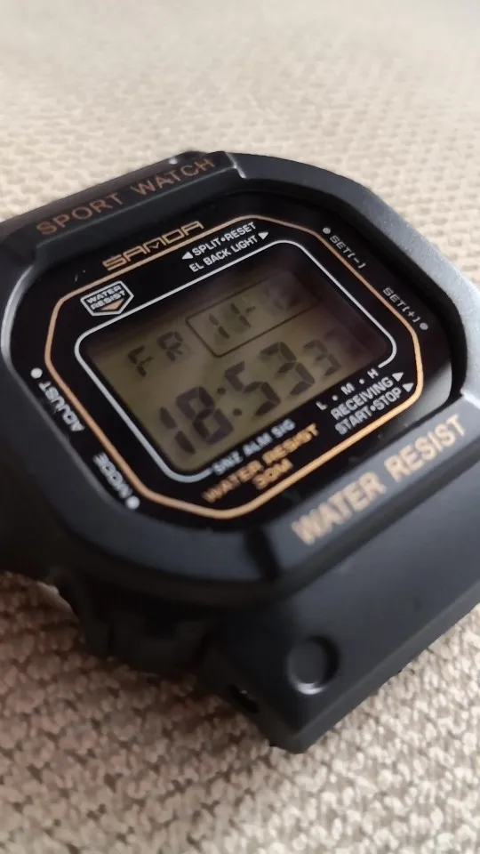 В золотом цвете фон дисплея вообще круть! Форма цифр как в Касио. Углы обзора жк не супер, но сносные. Важен ежечасный сигнал, здесь он ужасен - громкий биип длиной в секунду. Не хватает таймера и классически расположенных кнопок меню. Но за свою цену часы нравятся.
