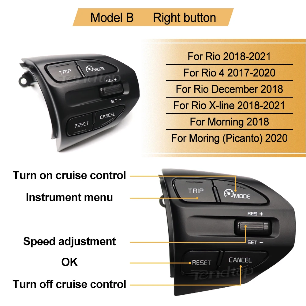 Применение:Модель AДля Rio 2017 2018 2019 год (нужен провод)Для Rio X-line 2017 2018 2019 2020 годДля Rio 5 2020 годДля Kia Stonic 2018 год (нужен Соединительный провод)Для Rio 4 2017 годМодель BДля Rio 2018 2019 2020 2021 годДля Rio 4 2017 2018 2019 2020 годДля Rio December 2018Для Rio X-line 2018 2019 2020 2021 годДля утреннего 2018 годаДля Moring (Picanto)2020 годМодель CДля Rio 2018 2019 годДля Rio 4 2019 годДля Rio X-line 2017 2018 2019 годДля утреннего 2018 года Moring (Picanto)2020 годаДля Rio ikslain, 2019Для Rio August 2018Для Rio luxe red line 2018Для автомобиля Rio red line October 2018Модель DДля Kia Rio 2017-2018Сменный провод (красный провод в этом списке):-Для провода, который был сломан в оригинальной системе рулевого управления,E. g. Провод внутри часового механизма подушки безопасности.-Дополнительный провод, который необходим для провода, которого нет в оригинальной системе рулевого колесаВажное Примечание перед покупкой:1. Правая сторона круизной функции нужна DVD GPS плеер для поддержки. Все функции кнопки переходят к настройке на dvd-плеере.2. Мы гарантируем высокое качество и проверяем, что все хорошо работают перед отправкой. Вы обнаружите, что это лучшее предложение, если вы покупаете. Мы предоставим Вам лучший сервис.3. Единственный способ быть на 100% уверенным, что деталь подойдет вашему автомобилю-это проверить ваш оригинальный номер детали, вы также можете позвонить своему местному дилеру или написать мне о помощи.4. Мы поддерживаем оптовиков. Оптовики имеют большие скидки