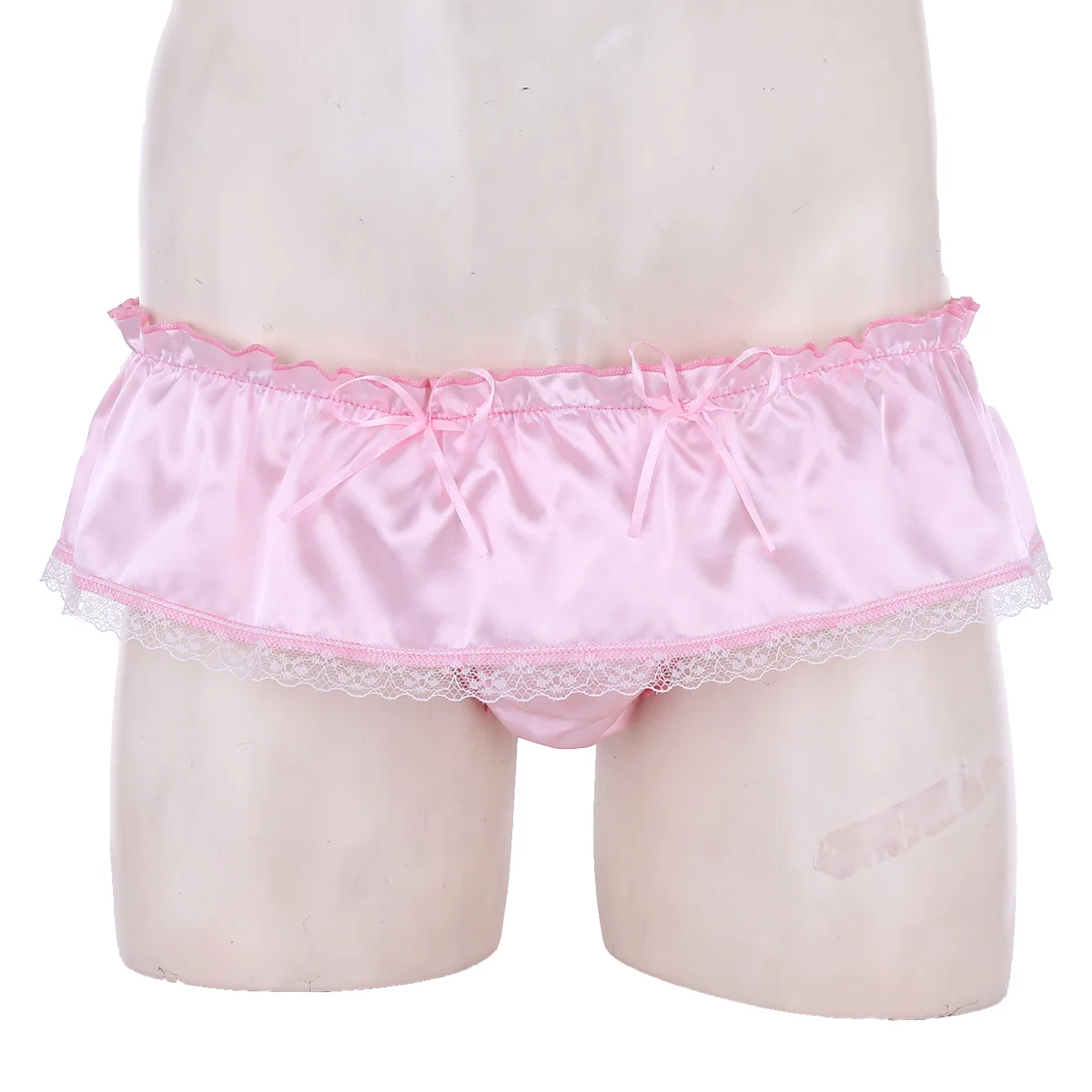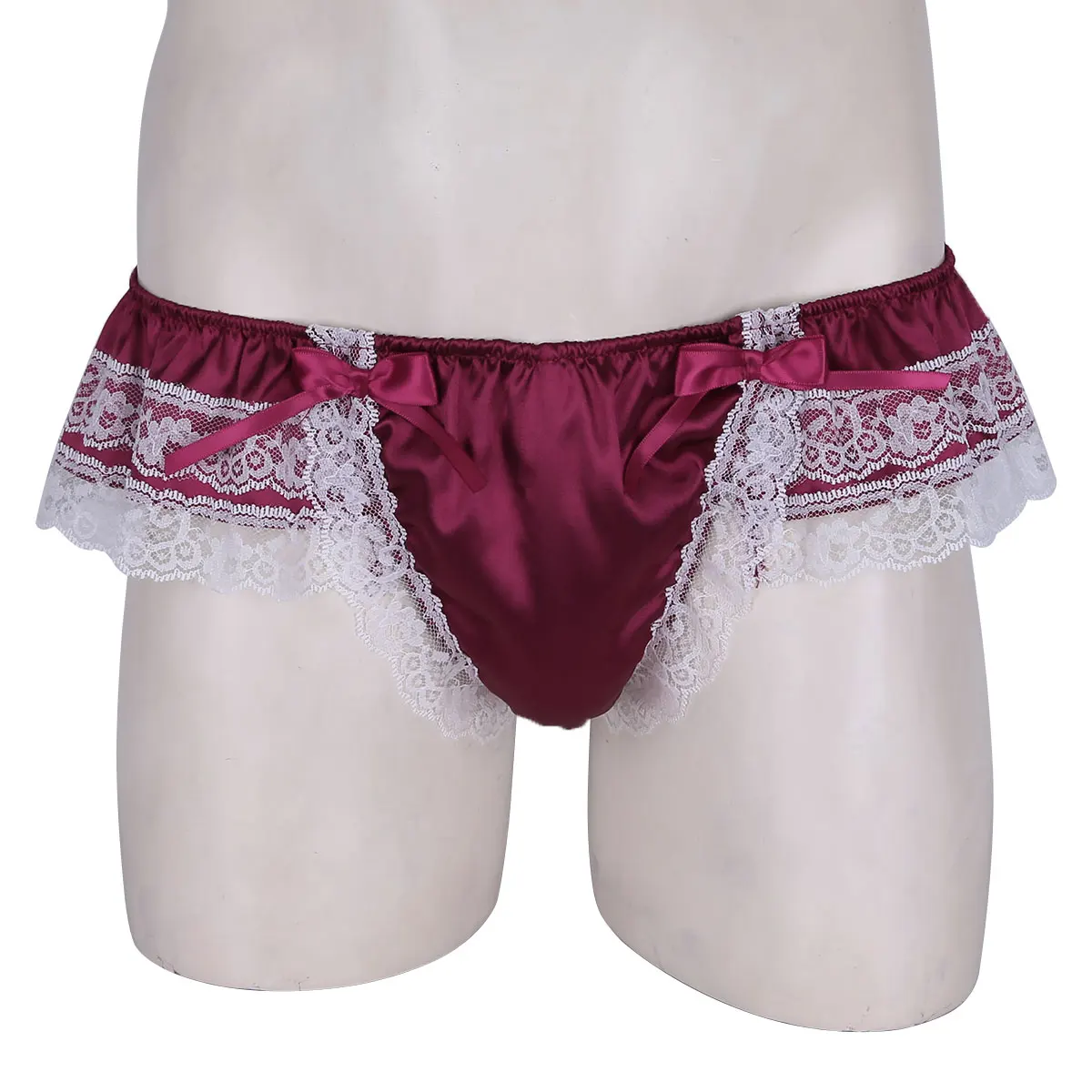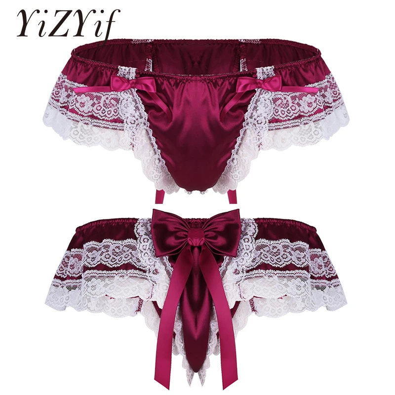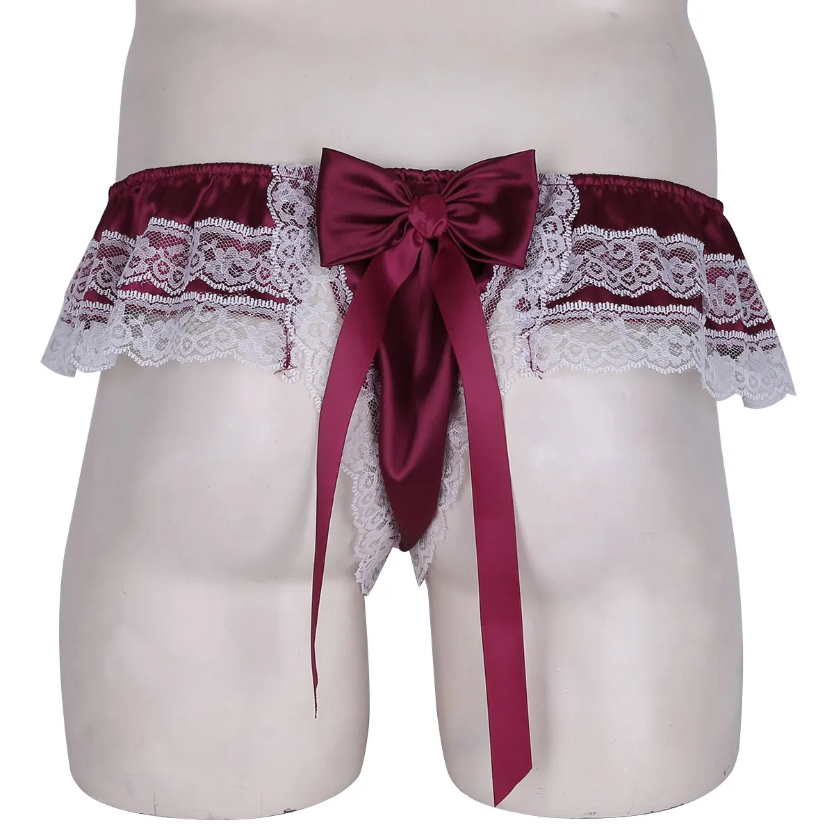 Мужские Трусы-стринги Sissy, блестящее мягкое атласное нижнее белье, Двухслойное цветочное кружевное нижнее белье с большим бантом сзади