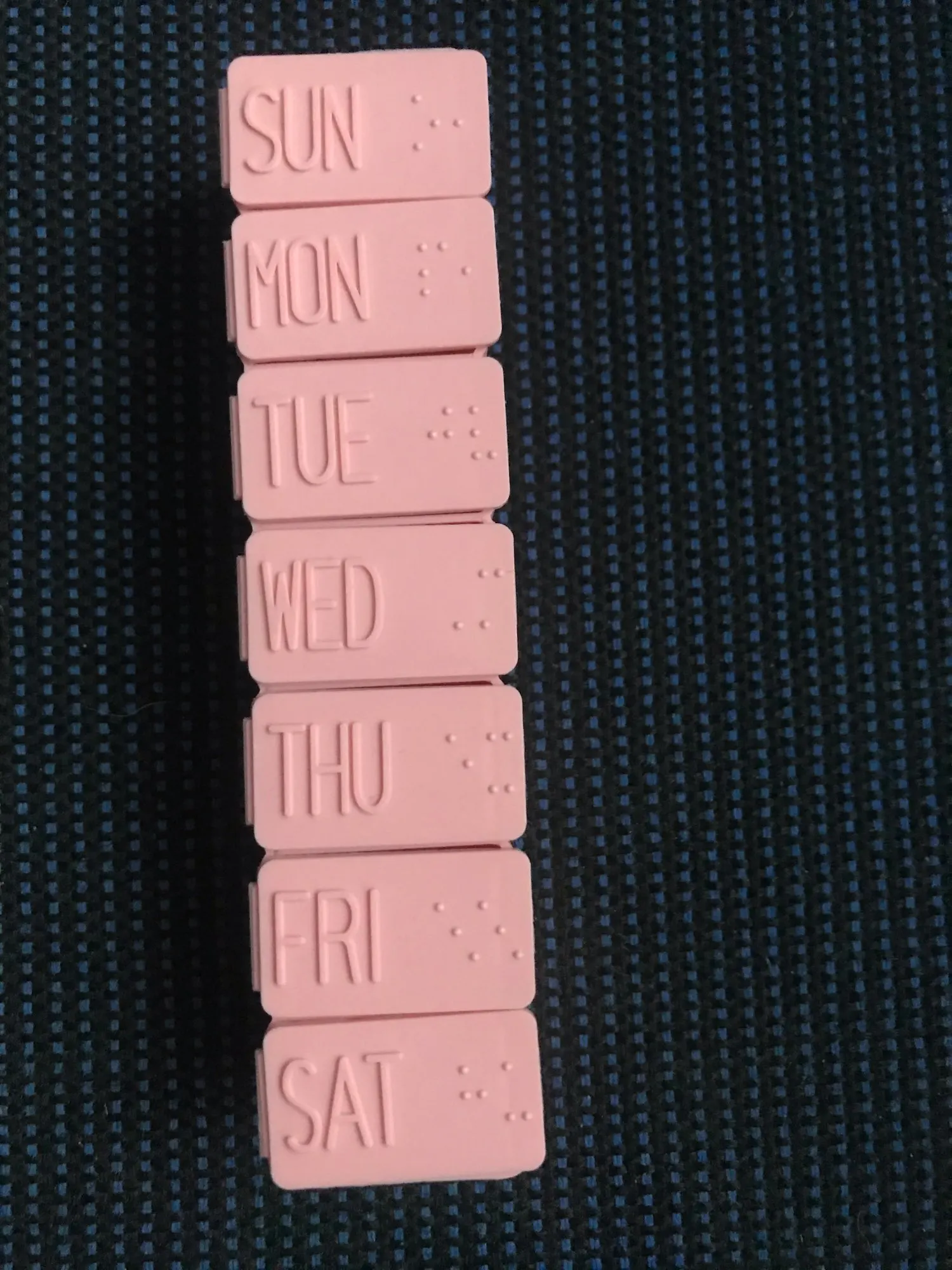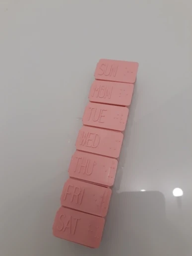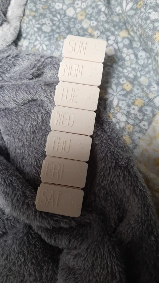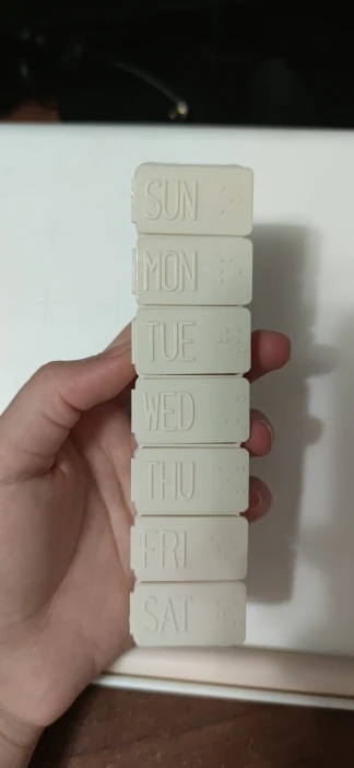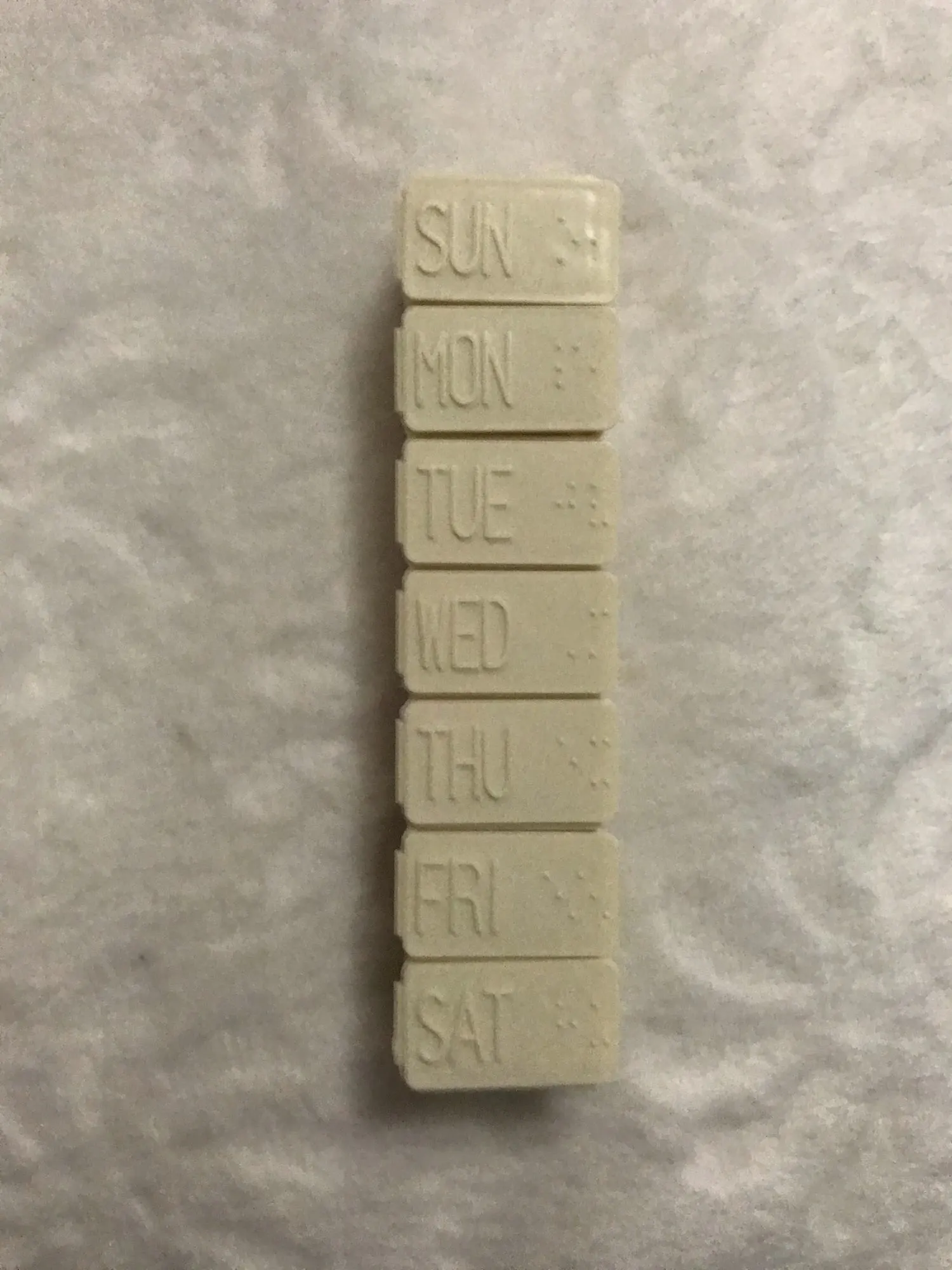 Длина 13 см, глубина 2,5 см. Красивая, небольшая коробочка с днями недели, есть даже шрифт для слепых, однако верхний отсек называется не "понедельник", а "воскресенье". Пластик на перемычке слабоват, в остальных местах хороший