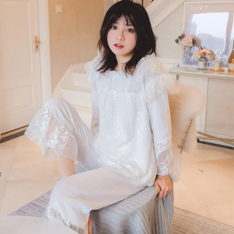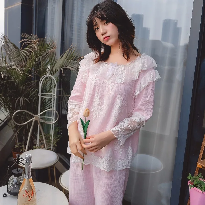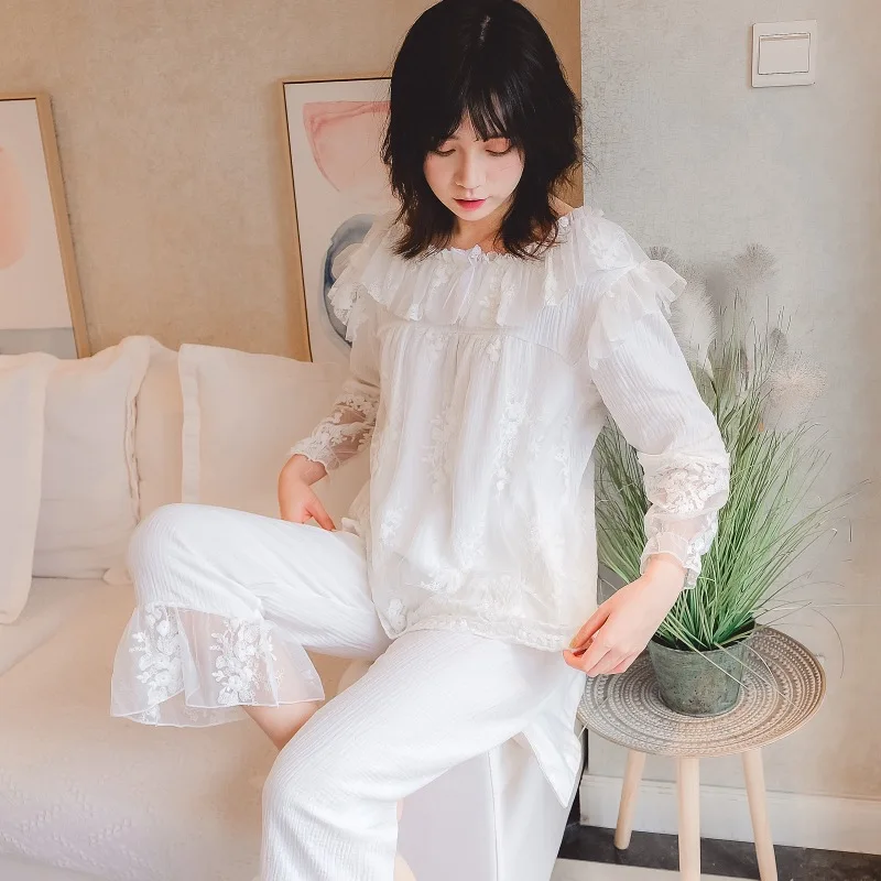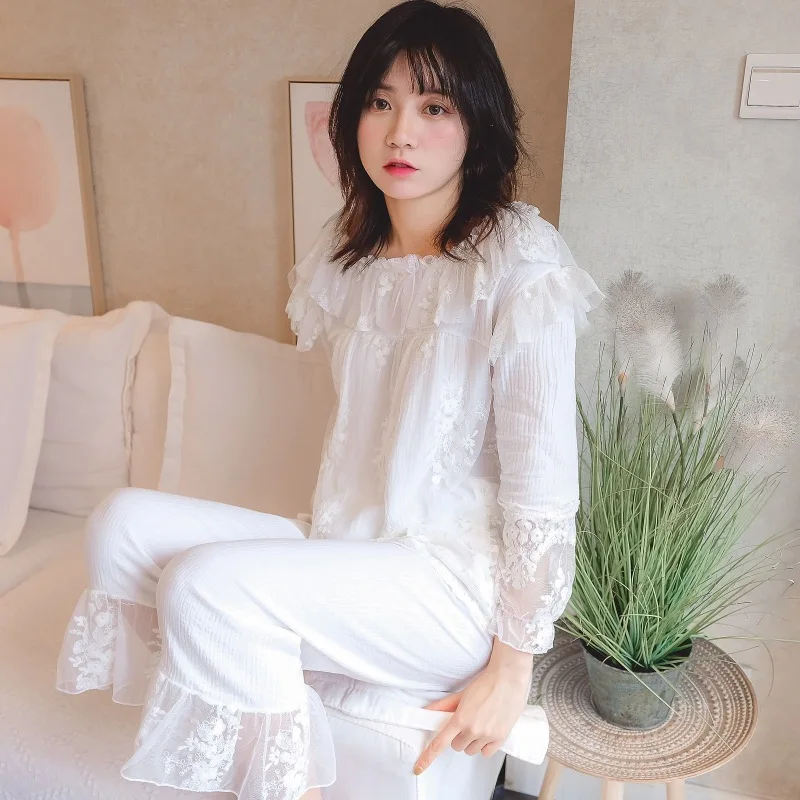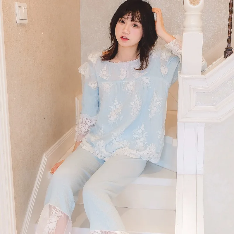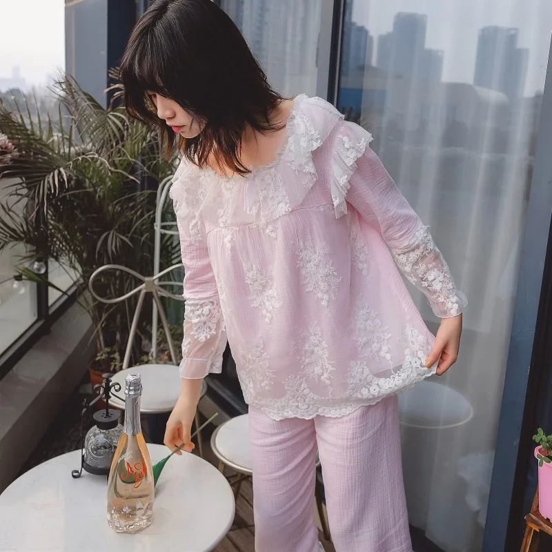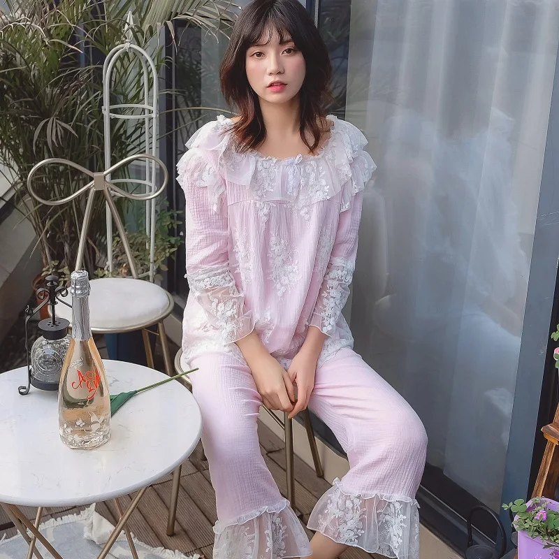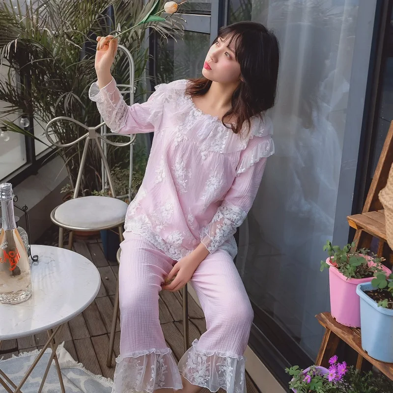 Новый милый кружевной женский весенне-осенний костюм принцессы Корейская версия Дворцовой пижамы с длинными рукавами хлопковый Повседневный домашний костюм