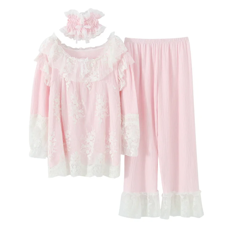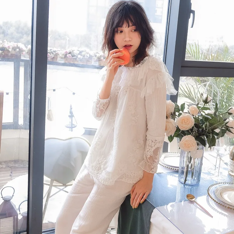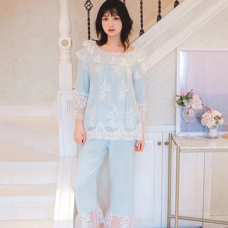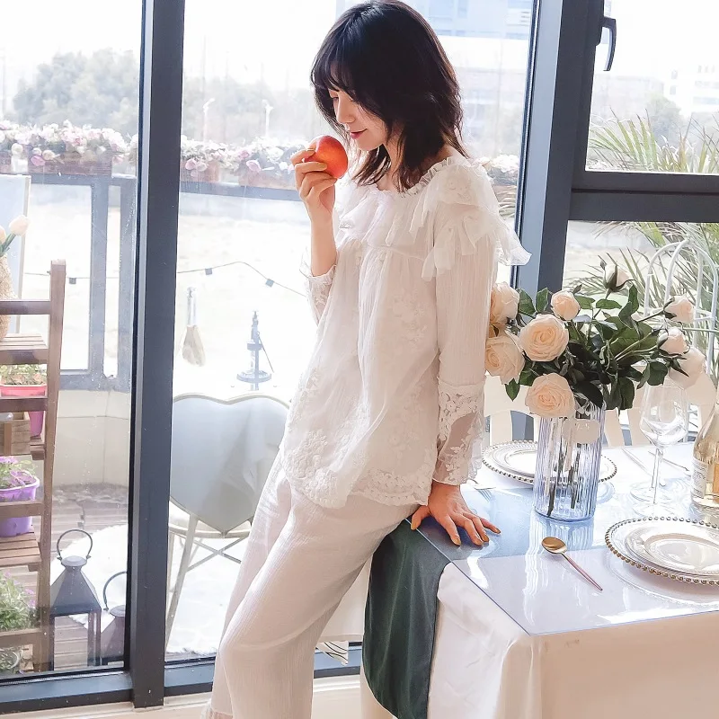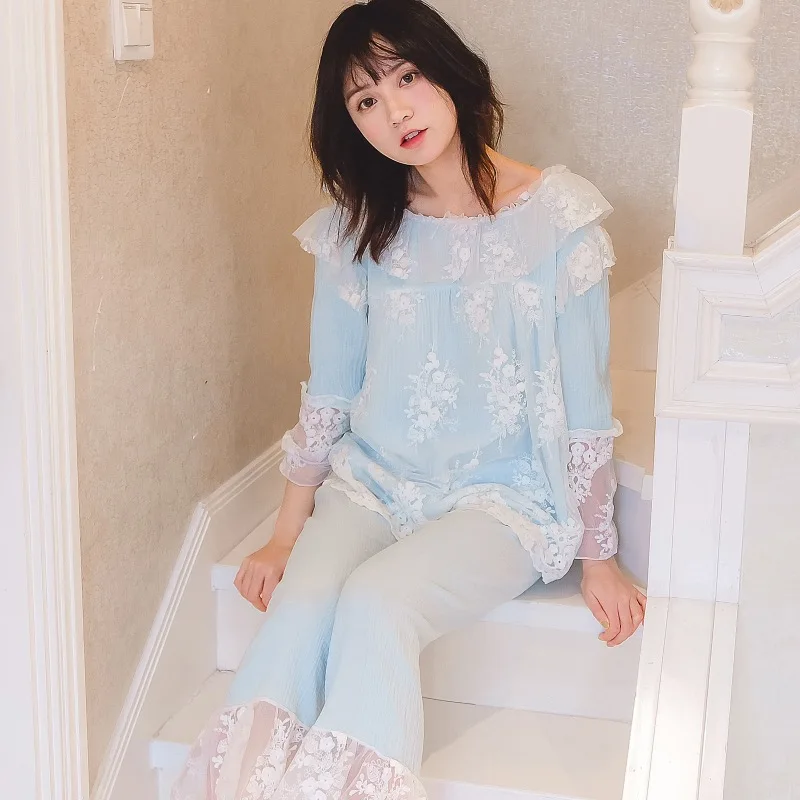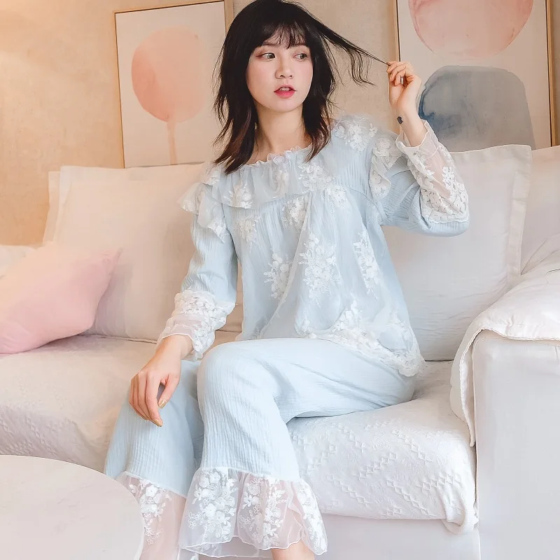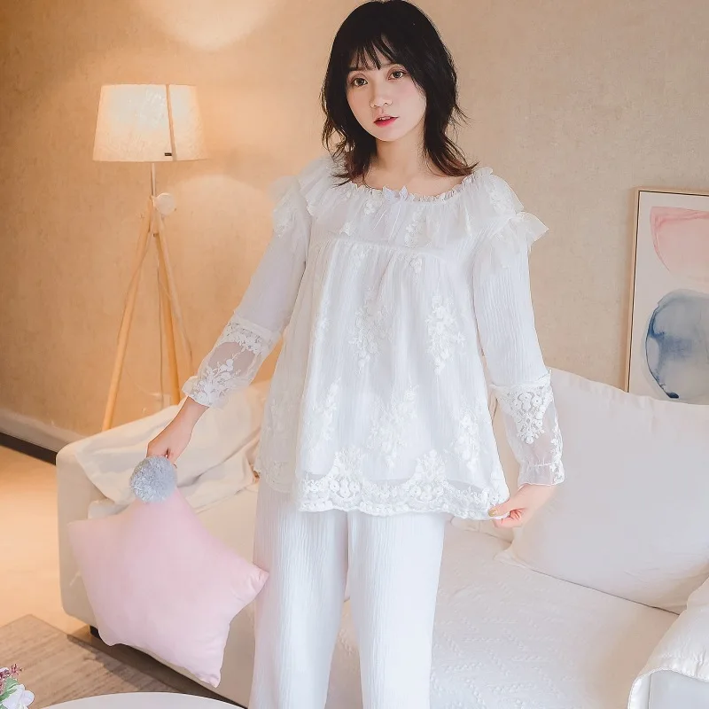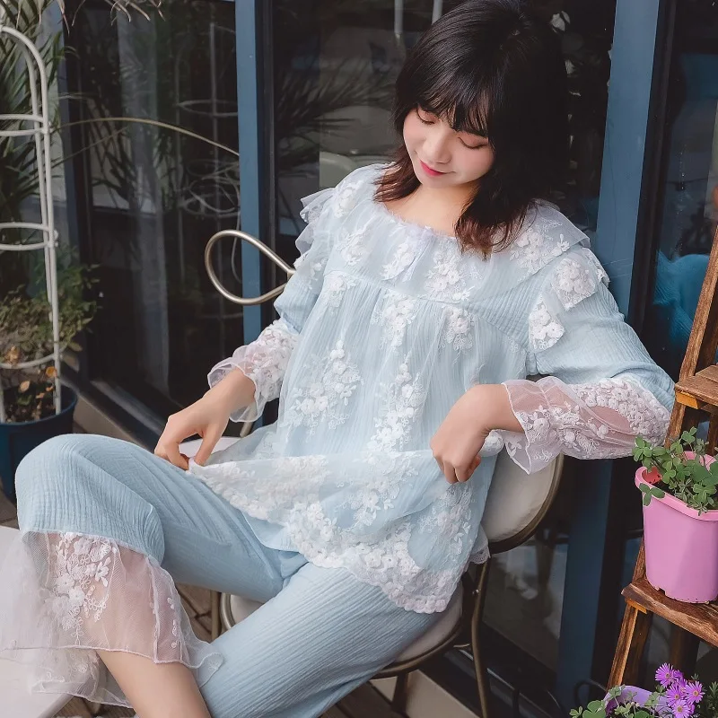 Новый милый кружевной женский весенне-осенний костюм принцессы Корейская версия Дворцовой пижамы с длинными рукавами хлопковый Повседневный домашний костюм