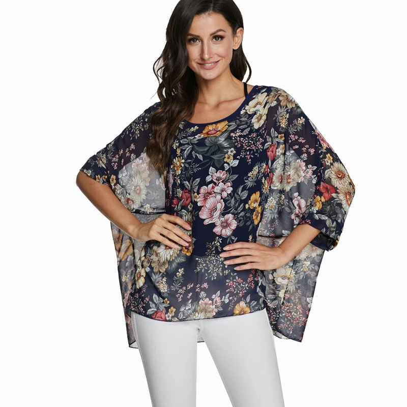 Женская шифоновая блузка BHflutter, черная блузка с цветочным принтом и рукавом летучая мышь, летний топ