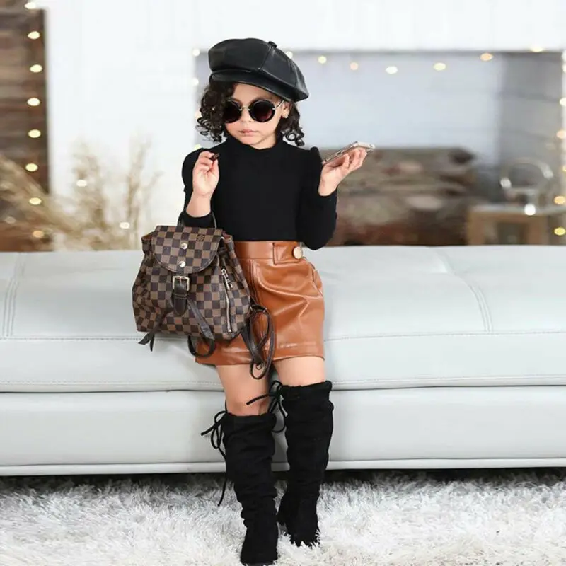 2 шт., Детская Хлопковая Водолазка с длинным рукавом и кожаная юбка