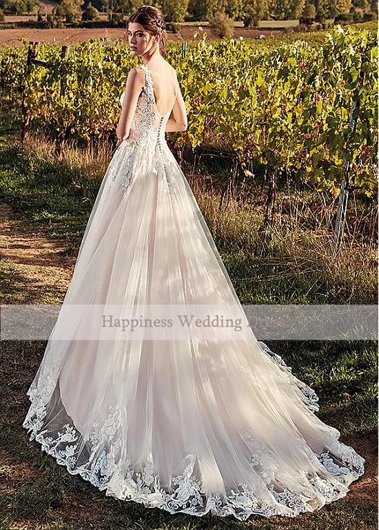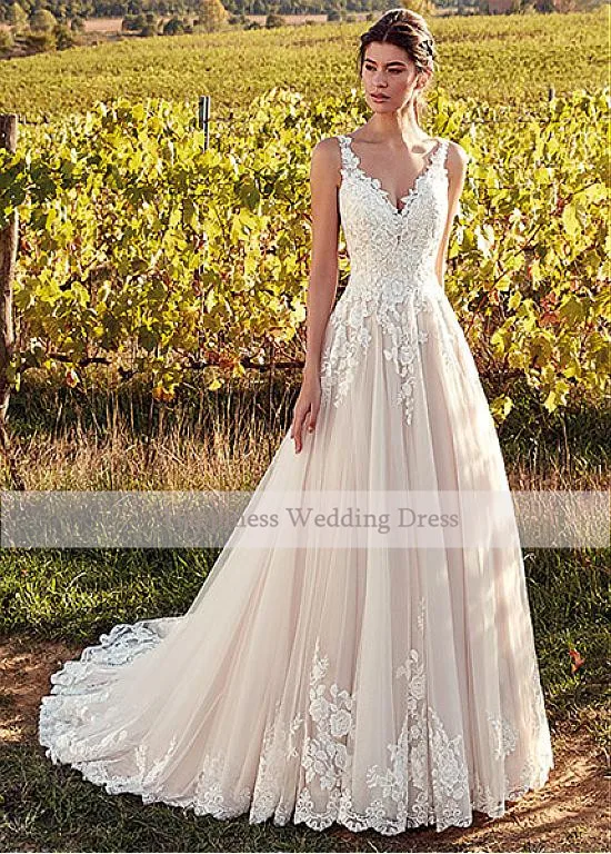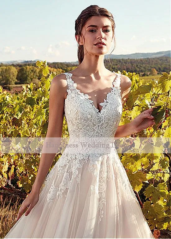 Свадебные платья цвета шампанского, с V-образным вырезом, трапециевидной формы, с аппликацией, в пол, 2020
