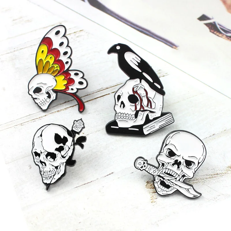 Белая металлическая эмалированная брошь в виде скелета, булавка с черной вороной, бабочкой, цветком розы, булавка, готический тренд, аксессуар для костюма, шляпы, ювелирные изделия, подарок