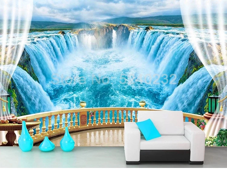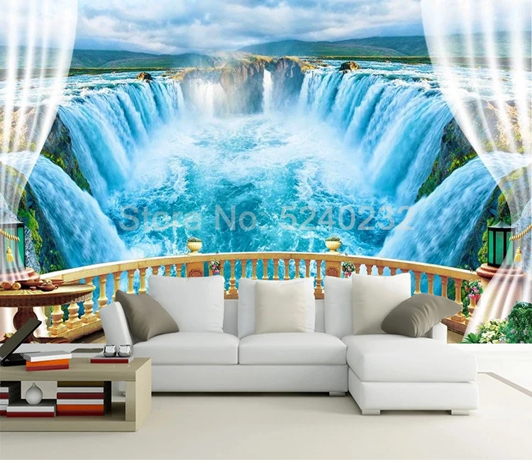 Пользовательские росписи 3D Окна Балкон озеро с водопадом Природа Пейзаж Плакат фото обои для гостиной спальни Papel де Parede