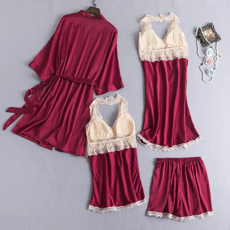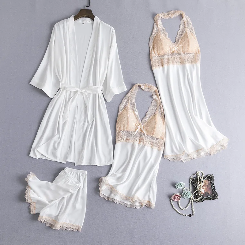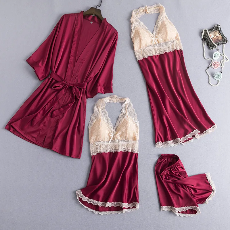 Пижамный комплект из 4 предметов, Сексуальная кружевная атласная одежда для сна, женская модная летняя Весенняя Пижама для женщин, халат для сна и отдыха