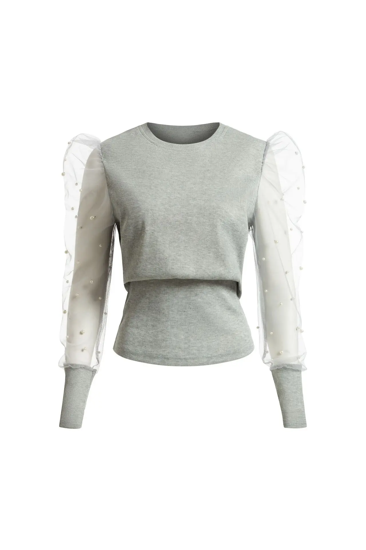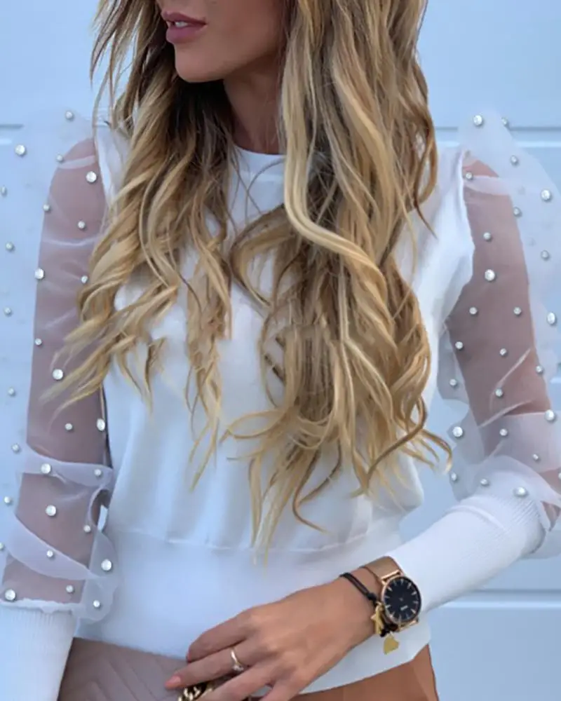 Блузка женская с круглым вырезом, элегантный Стильный Эластичный Топ с рукавами из фатина, с бусинами и жемчужинами, в стиле пэчворк, весна 2021