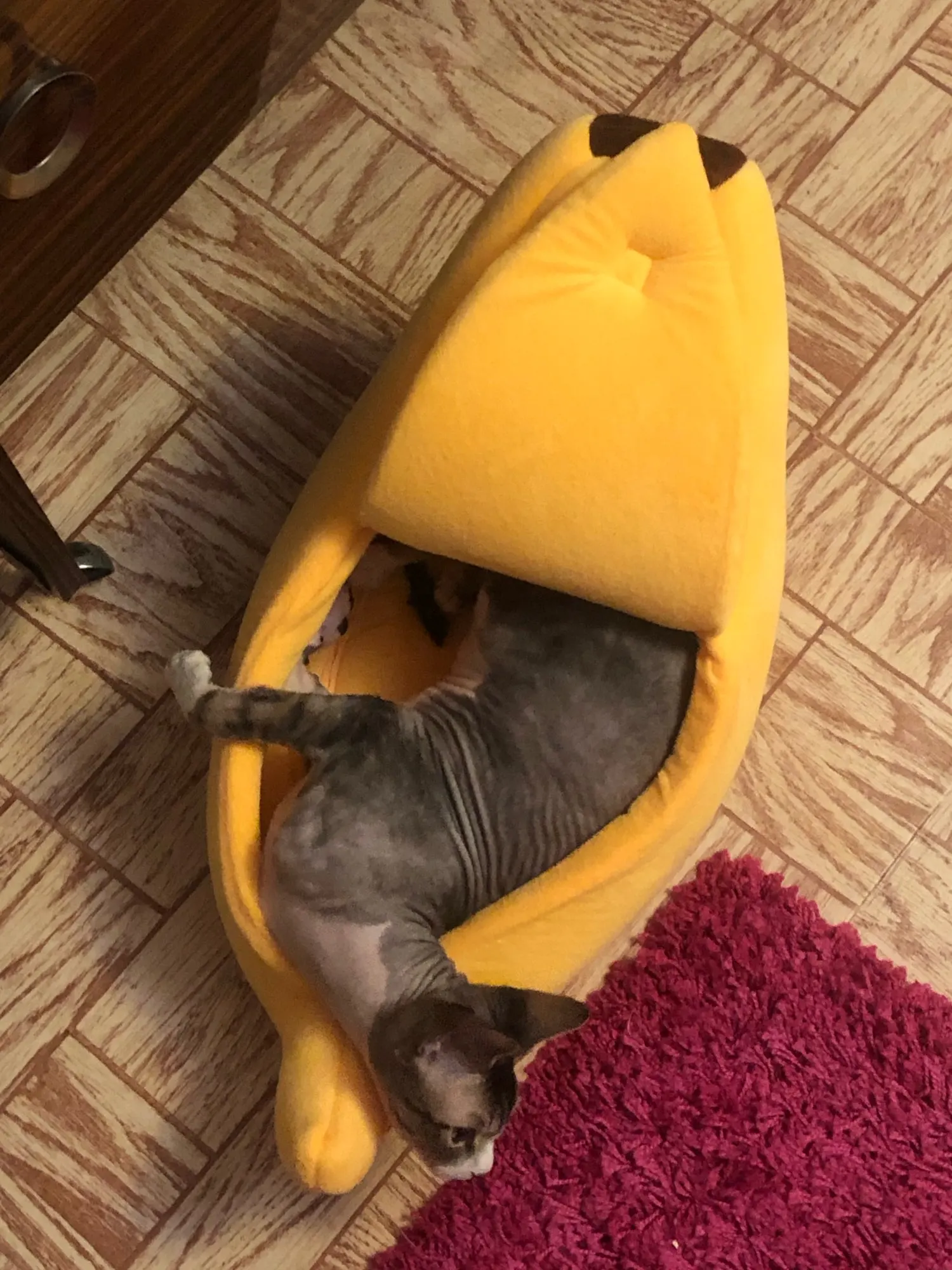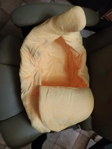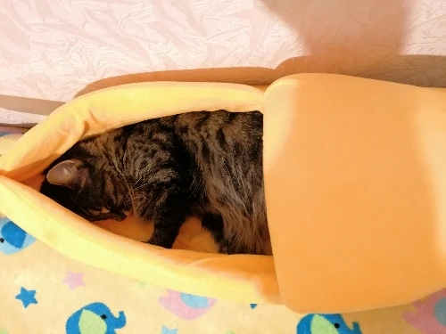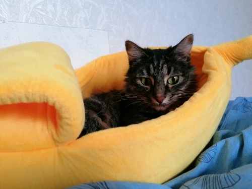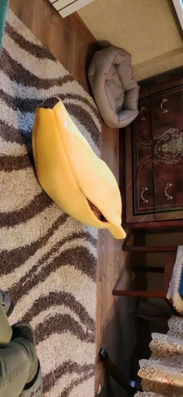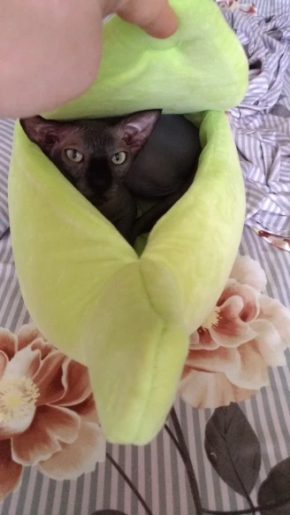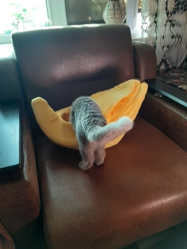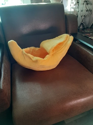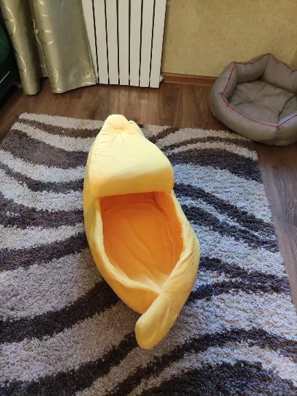 Офигенный банан, кошки сразу его полюбили. Брала размер L, думала что две кошки там поместятся, но вдвоём они почему-то туда не лезут, хотя одна кошка очень толстая и занимает почти весь банан. Можно ставить на пол как отдельный дом, или можно ставить на кровать как мягкую игрушку. Поначалу он был бесформенный, но за день расправился, запах тоже быстро выветрился, даже не стала стирать. Кошка не всегда понимает, как залезть внутрь, иногда просто сидит сверху, но ей нравится. Через некоторое время покрывается шерстью, что логично, чистится так же как и обычное покрывало. Короче стоит своих денег до копейки. Ещё попозже возьму чесночок от этого же продавца. Вобщем рекомендую, лучшая покупка 2020, сама бы там жила.