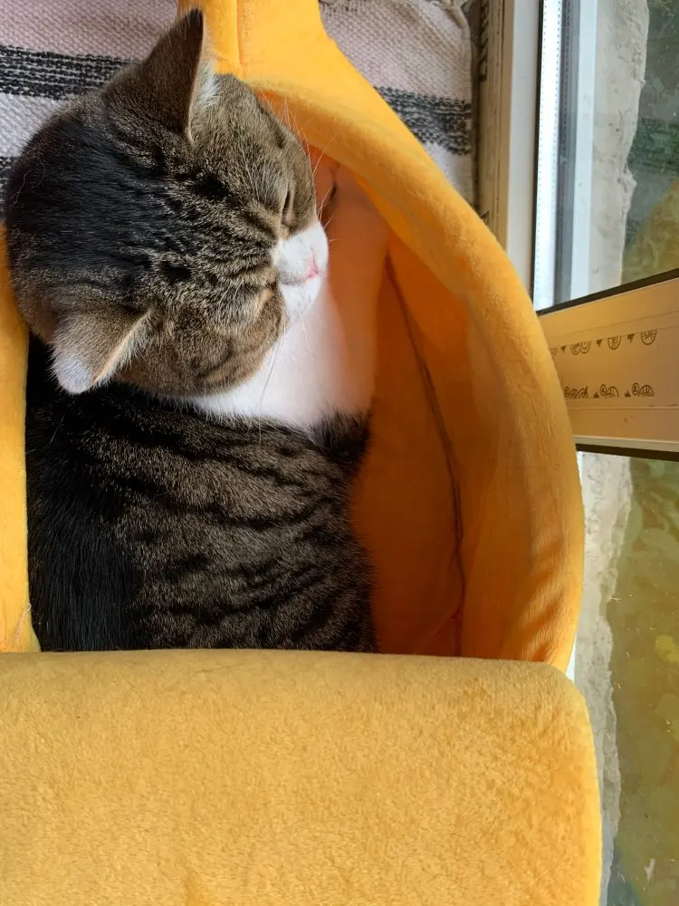 Очень крутой банан , мы с котом довольны. Я боялась, что Моджо не будет спать в нем, но банан победил. Пришла посылка достаточно быстро, чуть дольше 2х недель. Материал нормальный, форму держит . Размер брала Л- мой кот шотландец, весит около 4,5кг - в банане полтора кота свободно улягутся. Все супер, спасибо .