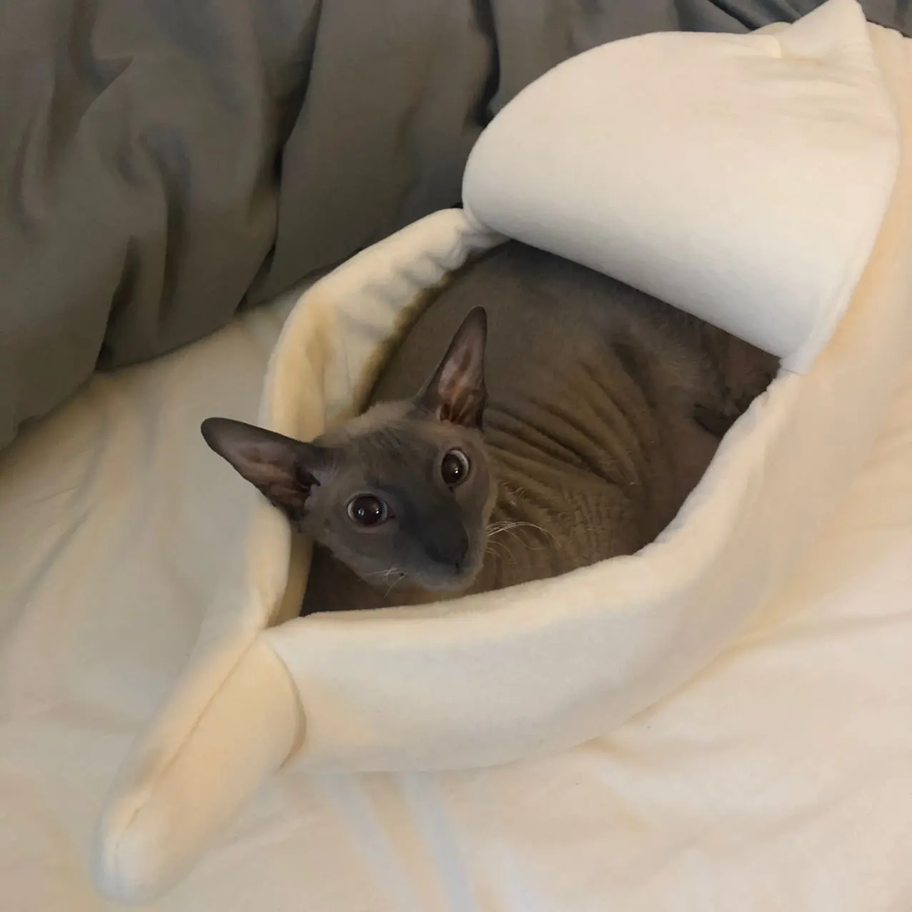 Замечательный домик! Пришёл быстро ,не отслеживался. Был помят ,но когда постирала и высушила повесив вертикально ,то принял идеальную свою форму. Кот сфинкс 4,5 кг очень свободно поместится в L . Спит в домике с удовольствием ,но ещё почему то любит драться с ним - нападает и кусает