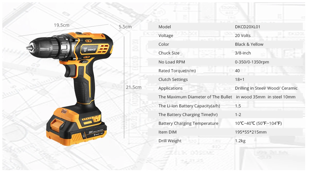 Электрическая Беспроводная Дрель DEKO Sharker, 20 в, со светодиодной подсветкой, с литиевым аккумулятором