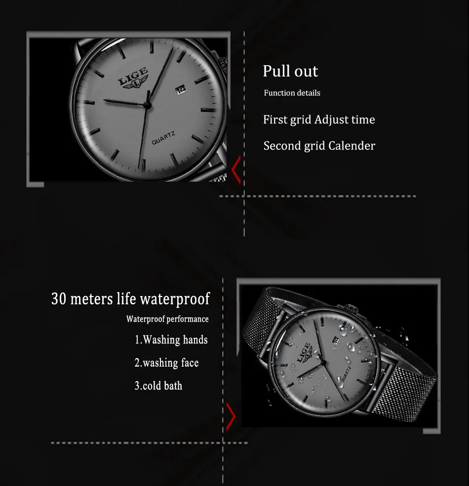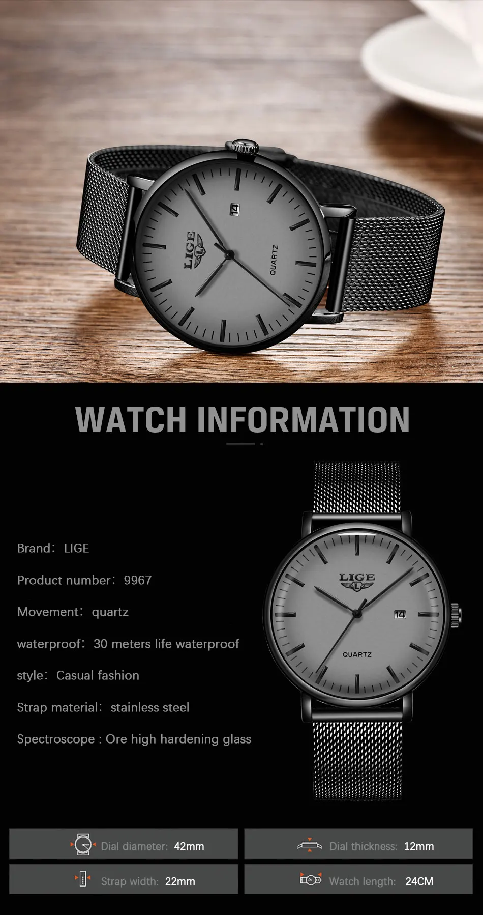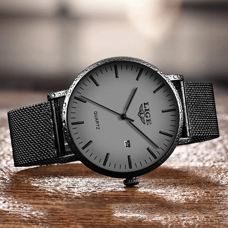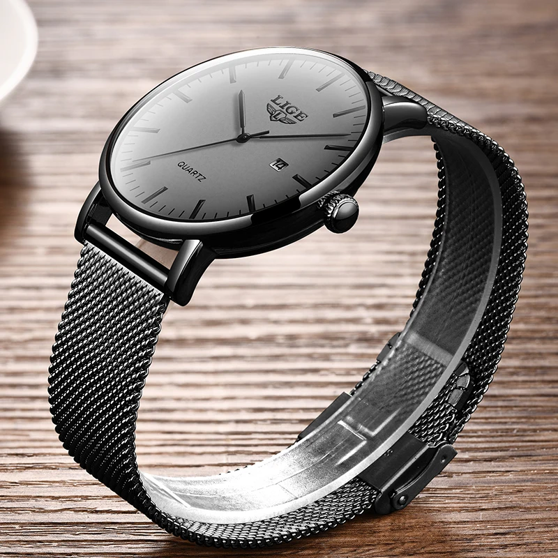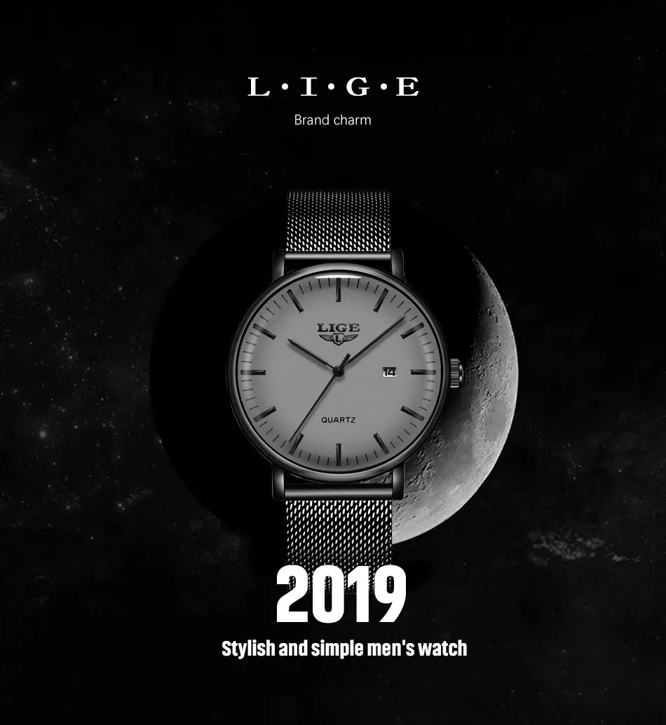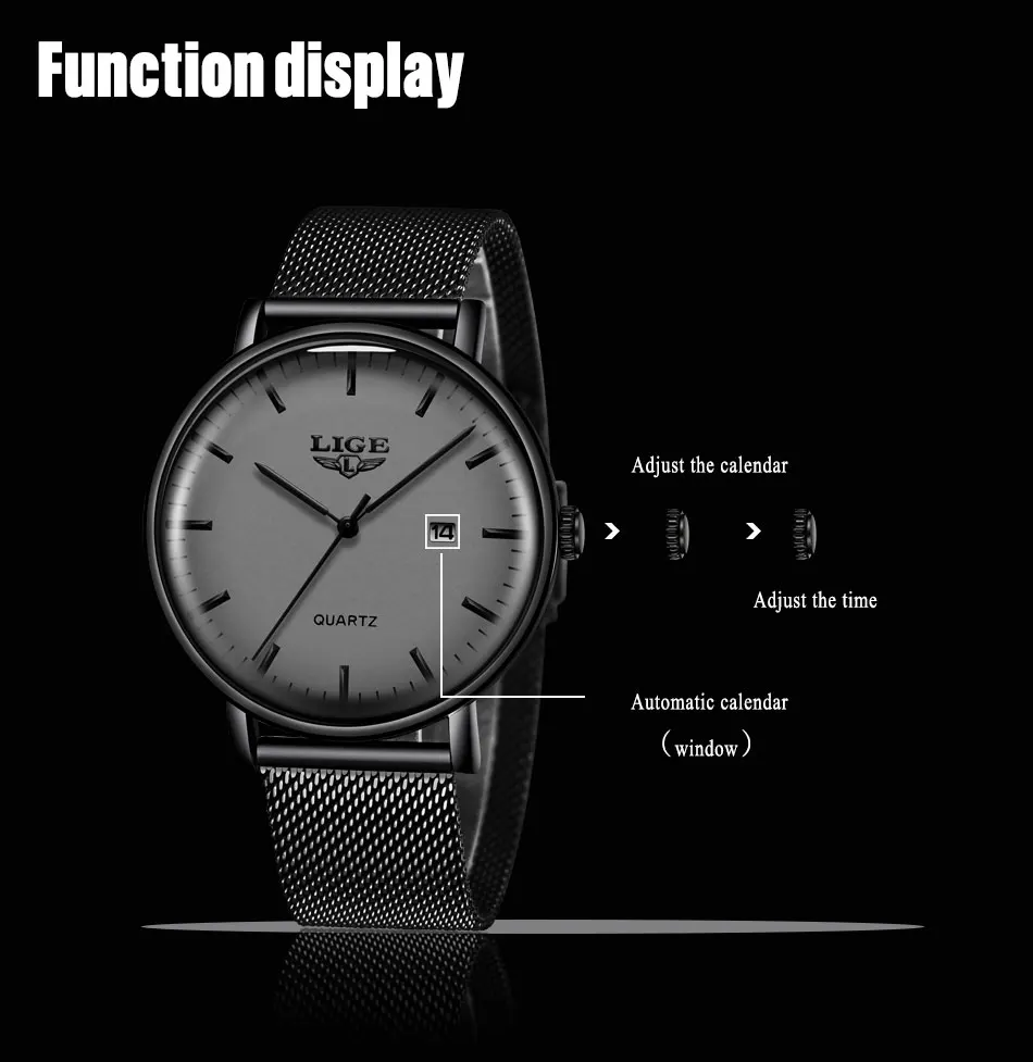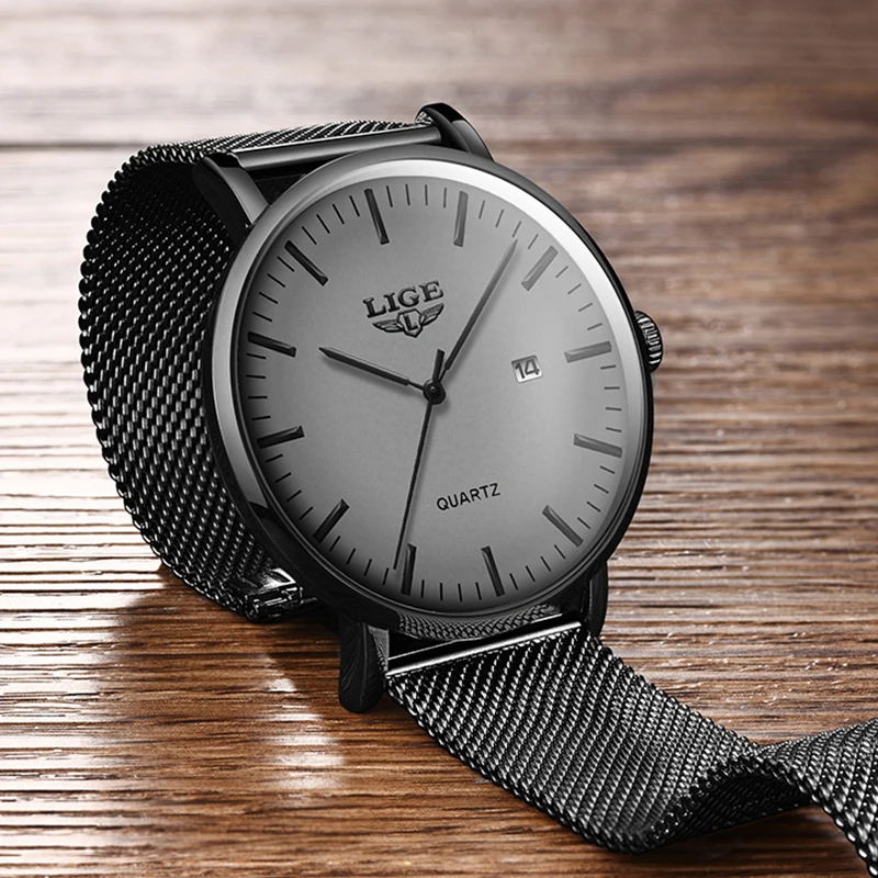 Часы наручные LIGE Мужские кварцевые, люксовые брендовые ультратонкие аналоговые с изогнутым зеркальным покрытием, деловые, 2022