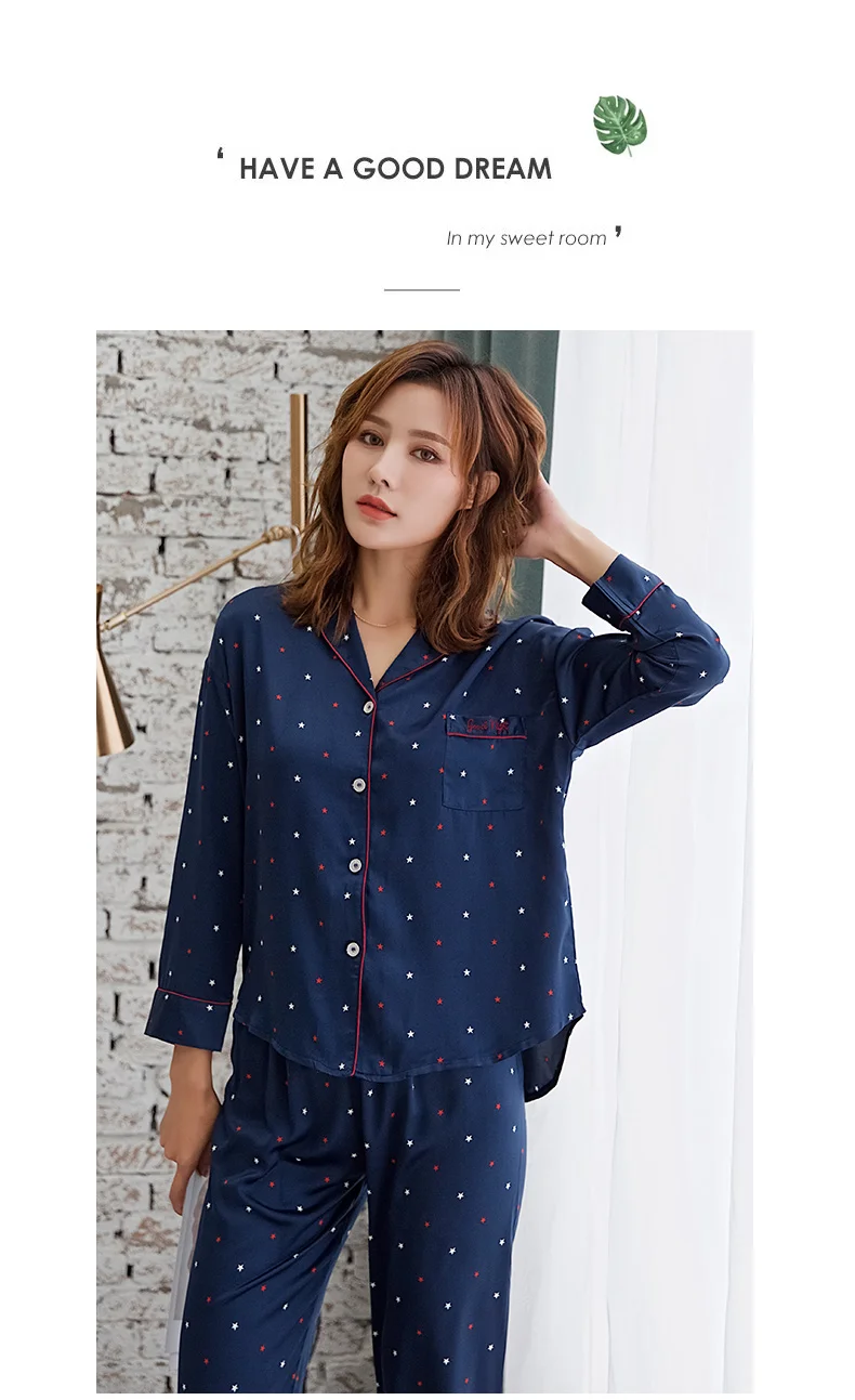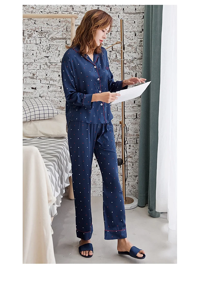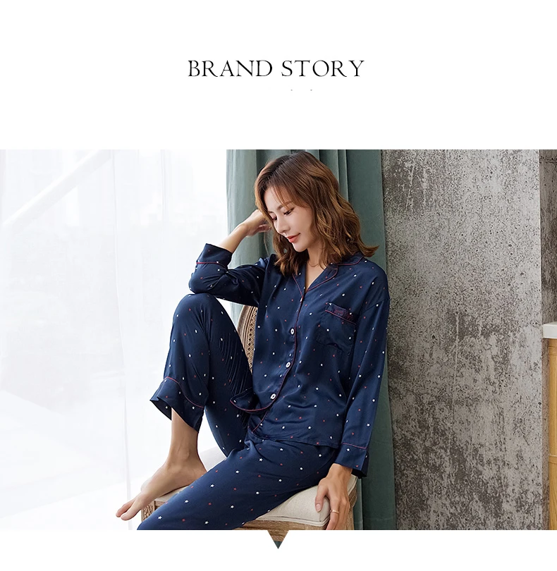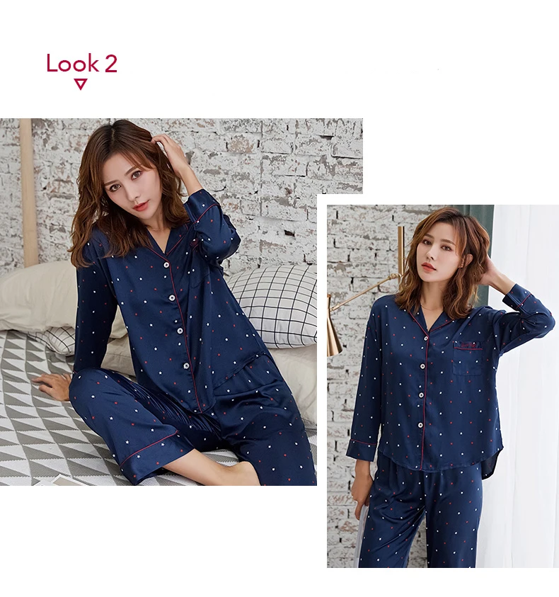 Весенне-осенняя шелковая пижама, Женские Простые комплекты, атласная шелковая Домашняя одежда с длинным рукавом, женская одежда для сна темно-синего цвета 9952F