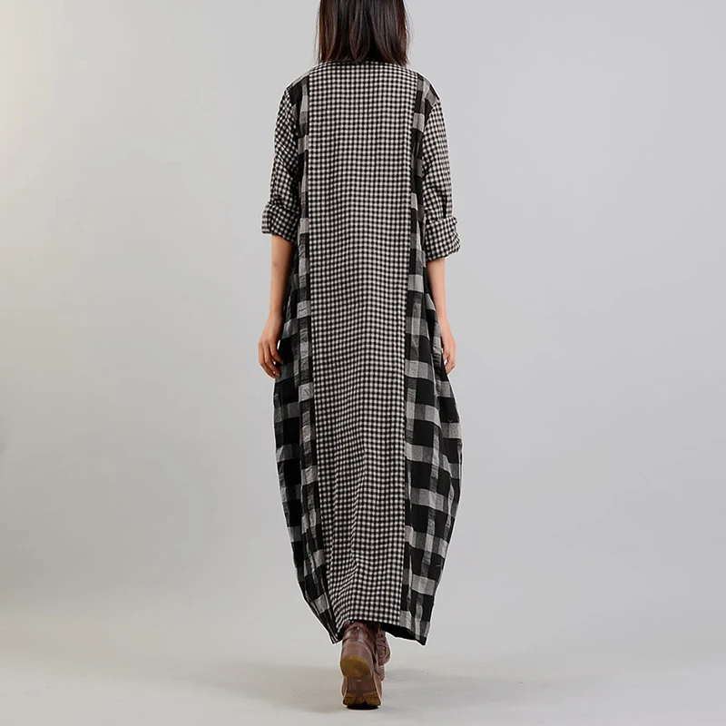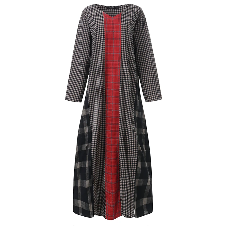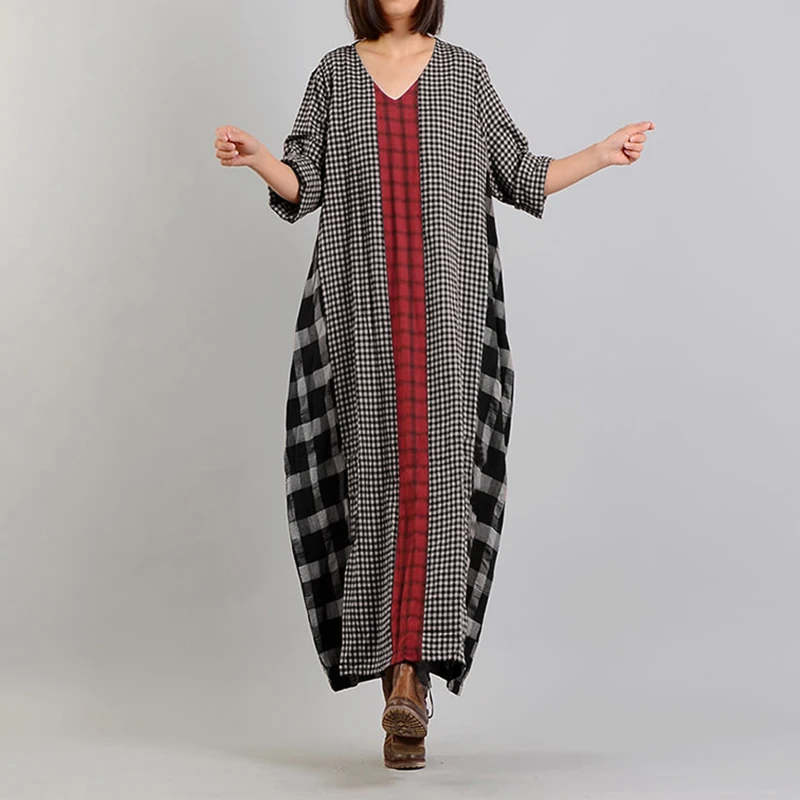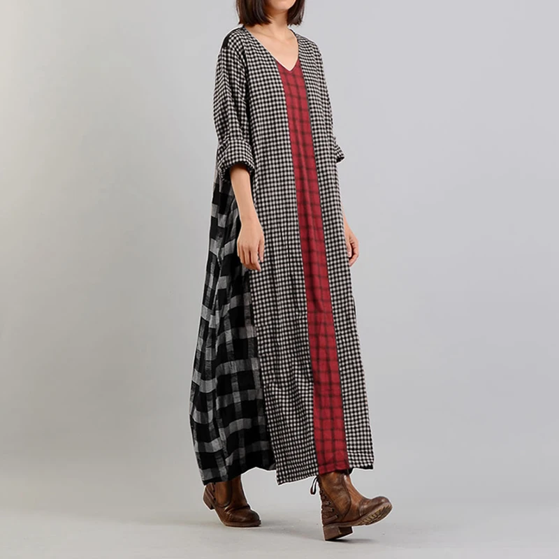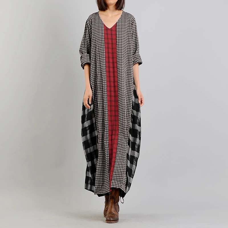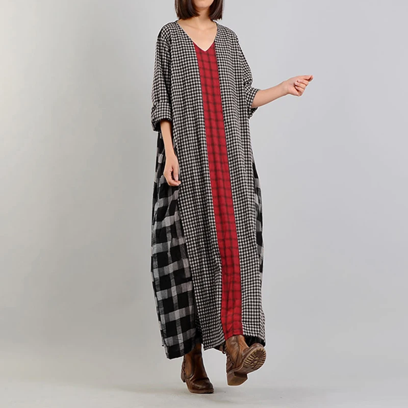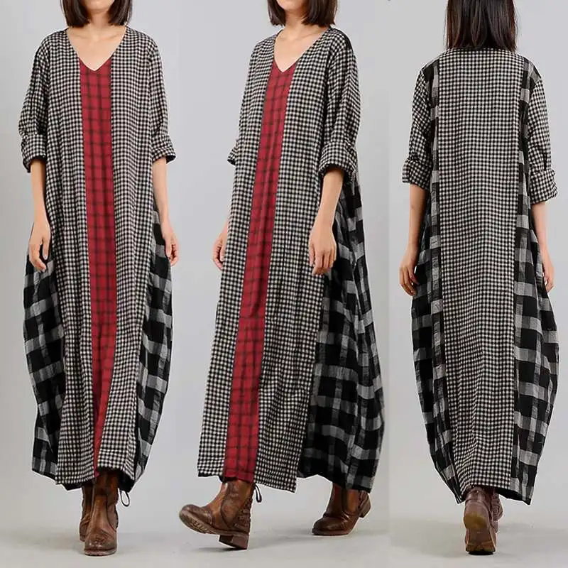 Женский сарафан в клетку, с длинным рукавом и V-образным вырезом