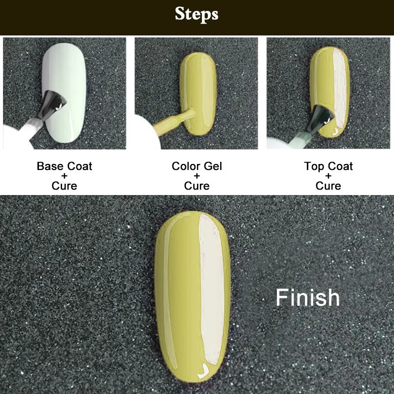 Шаги маникюра ногтей:1.-форма поверхности ногтей, очистите кутикулы, полировка поверхности ногтей и очистите пыль.2.-нанесите Базовое покрытие.Используйте светодиодную лампу в течение 60 секунд или УФ-лампу в течение 2 минут.3.-нанесите 1-й слой цветного геля.Используйте светодиодную лампу в течение 60 секунд или УФ-лампу в течение 2 минут.4.-нанесите 2-й или более слой цветного покрытия, если цвет не достаточно яркий.5.-нанесите верхнее покрытие.Используйте светодиодную лампу в течение 60 секунд или УФ-лампу в течение 2 минут.6.-протрите липкие остатки на ногтях очищающим средством.