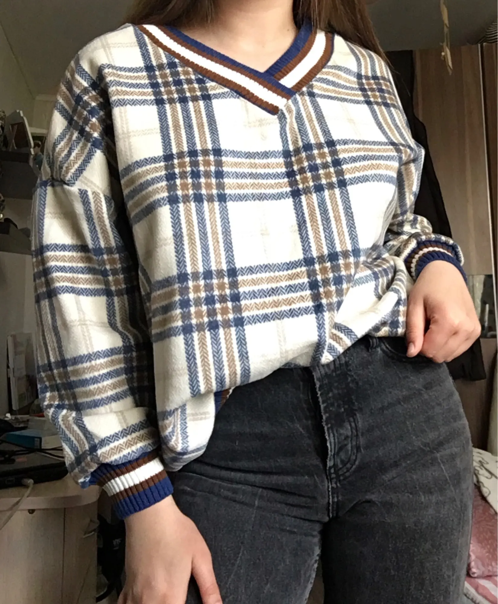 Зимние свободные шикарные клетчатые Осенние новые корейские топы с V-образным вырезом в стиле Харадзюку винтажные Простые Модные повседневные женские свитера в стиле бойфренд