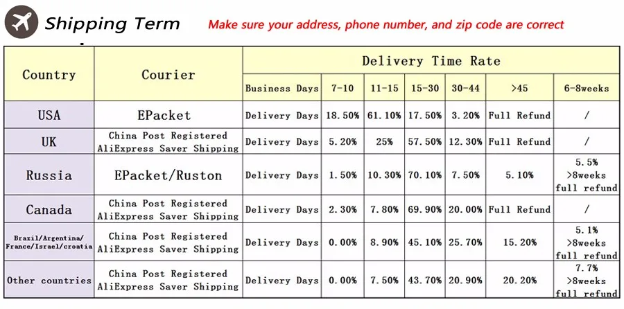 Наш товар бесплатная доставка в США, ЕС, Азию и так далее. Таможенные пошлины, налоги и НДС не включены в цену товара и стоимость доставки. Обычно мы отправляем товары по авиа-отправление Почты Китая для бесплатной доставки, около 7-55 дней может прибыть ваш адрес. Если вам нужна быстрая доставка DHL,UPS,TNT,FEDEX,EMS, хотя они не являются бесплатными, но могут получить очень хорошую скидку. При оформлении заказа выберите желаемый способ доставки в интернет-магазине. Мы заметим номер отслеживания в списке заказов или отправим вам электронное письмо.