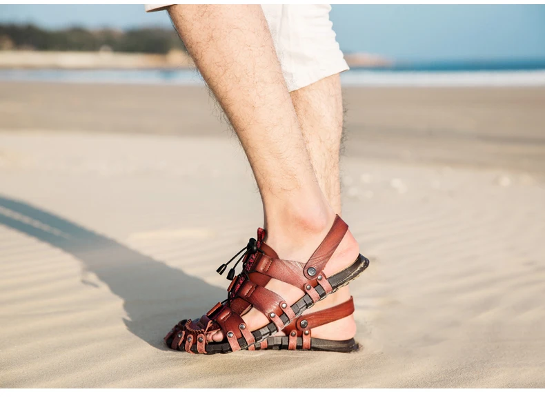Мужские сандалии из натуральной кожи, коричневые дышащие пляжные са...