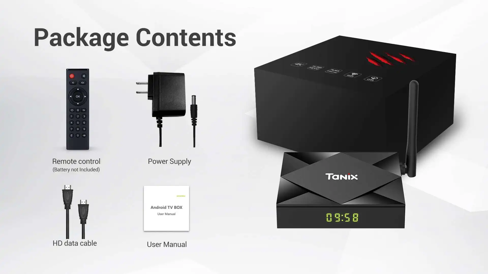 1 x ТВ-приставка Tanix TX6s H6161 x HD кабель1 х ИК-пульт дистанционного управления (без функции голосового управления)1 х адаптер питания1 х Руководство пользователя