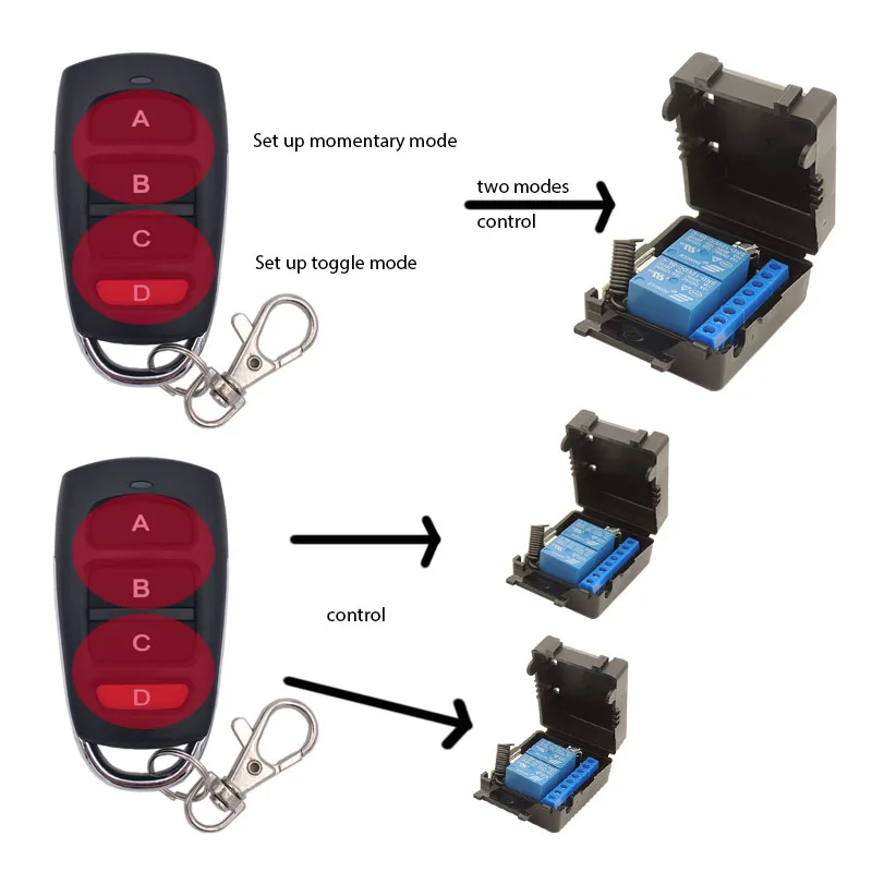 Режим переключения: 1. Нажмите кнопку "A", реле будетРабота; 2. Нажмите кнопку «A» снова, это реле будетСтоп. Режим блокировки: 1. Нажмите кнопку "A", реле будетРабота; 2. Нажмите кнопку "B", это реле будетСтоп. Удалите имеющиеся данные о режимах работы Нажмите и удерживайте кнопку обучения (на приемнике)5 секунд. Существующие данные будут удалены успешно.