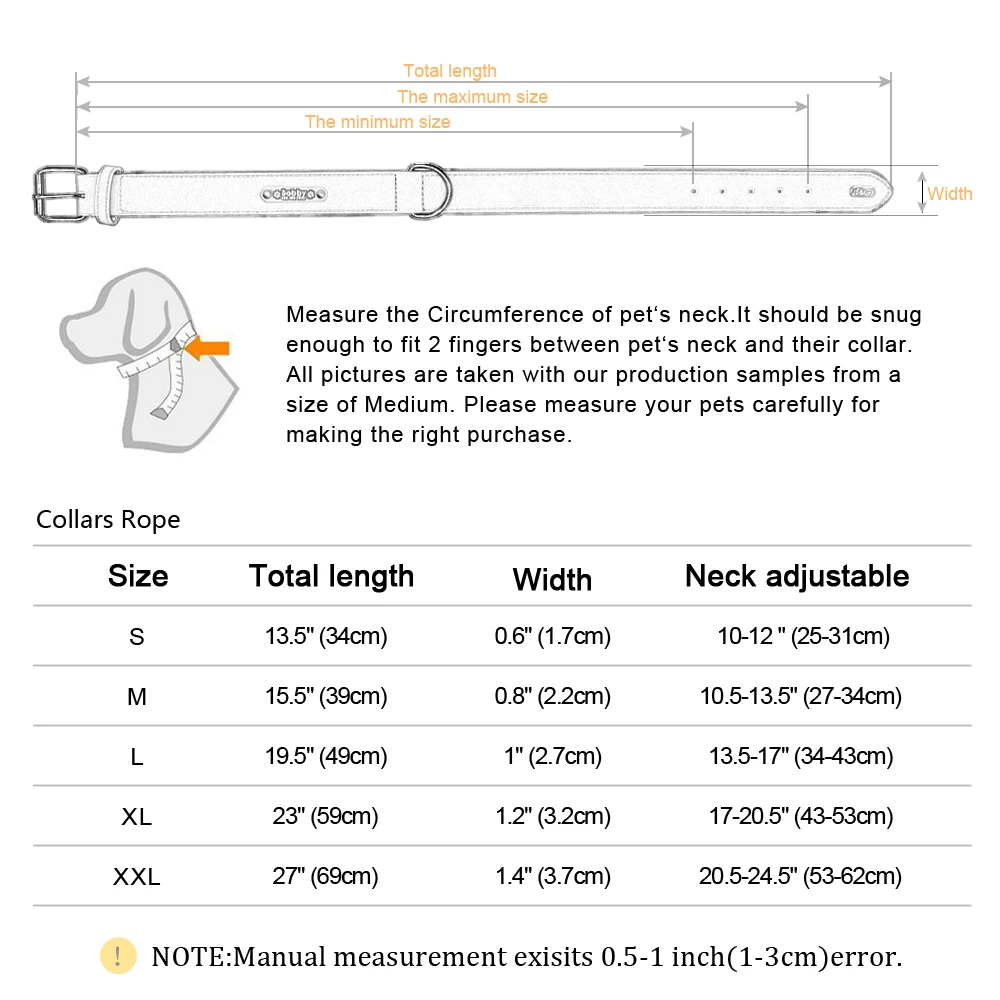 : S: Шея Регулируемая 10-12in, ширина 0.6in, общая длина 13.5inM: Шея Регулируемая 10,5-13.5in, ширина 0.8in, общая длина 15.5inL: Шея Регулируемая 13.5-17in, ширина 1in, общая длина 19,5 inXL: регулируемая Шея 17-20,5 дюйма, ширина 1,2 дюйма, общая длина 23 дюйма XXL: регулируемая шея 20,5-24,5 дюйма, ширина 1,4 дюйма, общая длина 27 дюймов