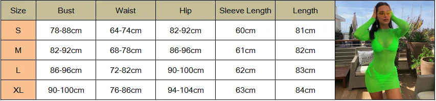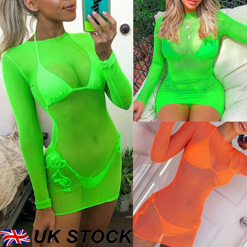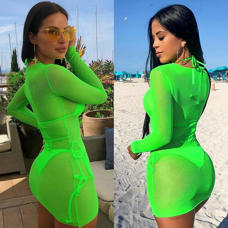 Женское Прозрачное Бикини с сеткой, купальник, прозрачный купальный костюм с длинным рукавом, неоновое зеленое летнее пляжное платье