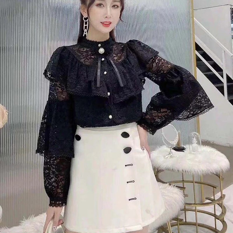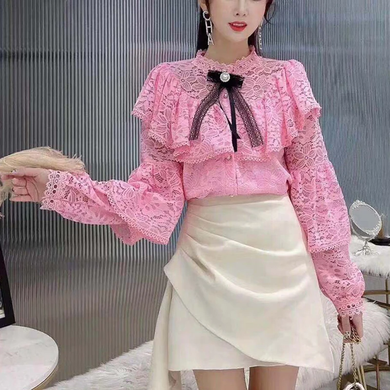 Женская кружевная блузка с оборками, y2k, винтажная рубашка с длинным рукавом и бантом, женская элегантная рубашка в стиле Харадзюку, 559B, 2021