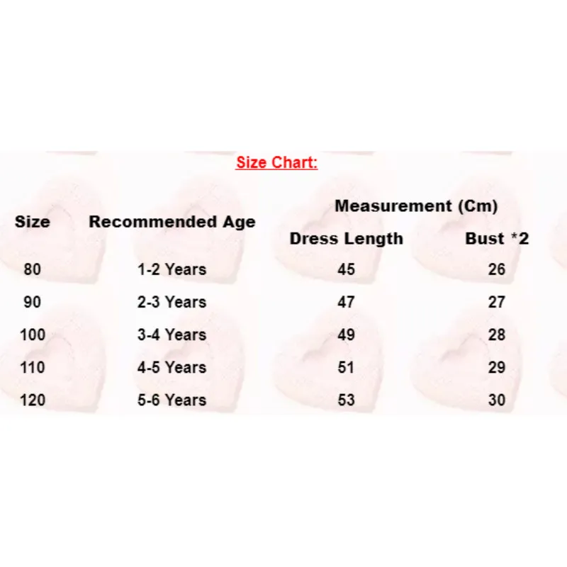 Размер Рекомендуемый возраст Размер (см) Платье Длина Размер бюста * 2 80 1-2Лет 45 26 90 2-3Лет 47 (Европа) 27 100 3-4Лет 49 28 110 4-5Лет 51 29 120 От 5 до 6 лет 53 30 Возможна погрешность в 2-3% в зависимости от измерения вручную. Прежде чем купить эту товарную позицию, просим тщательно свериться с таблицей размеров. 1 дюйм = 2,54 см Обратите внимание что небольшая разница в цвете считается приемлемой. Это может быть связано с положением источника света и с настройками экрана.Предварительный просмотр