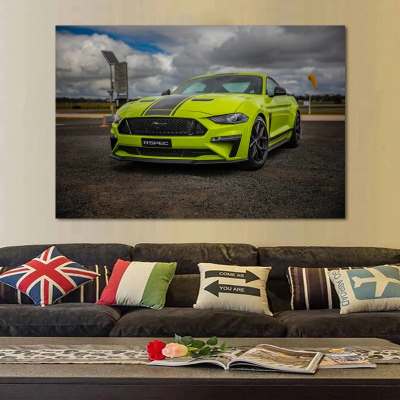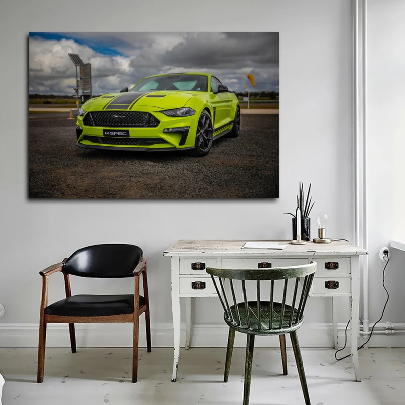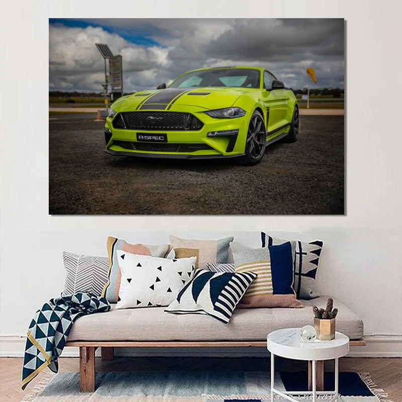 Плакат современное искусство, принт года, Картина на холсте с изображением мустанга, зеленого автомобиля, суперкара, декор для гостиной