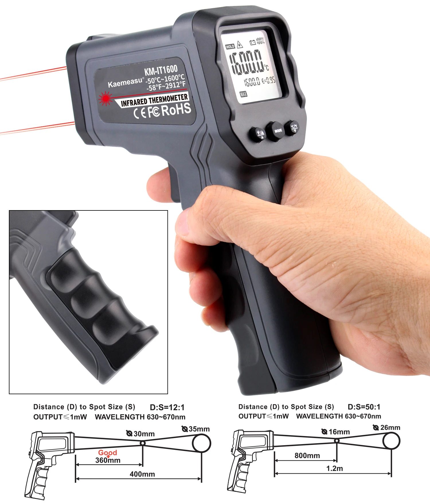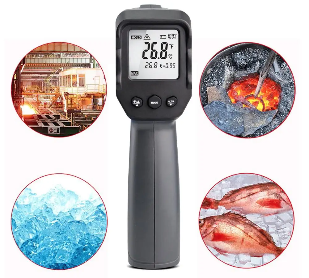 Ручной инфракрасный термометр бесконтактный одиночный/двойной лазерный Инфракрасный цифровой термометр пистолет-50 ~ 380/550/750/1100/1300/1600 ℃ Размер: 108*122*56 (мм) Вес: 0,35 кг Примечание: Это промышленный температурный термометр, который не подходит для измерения температуры человеческого тела.