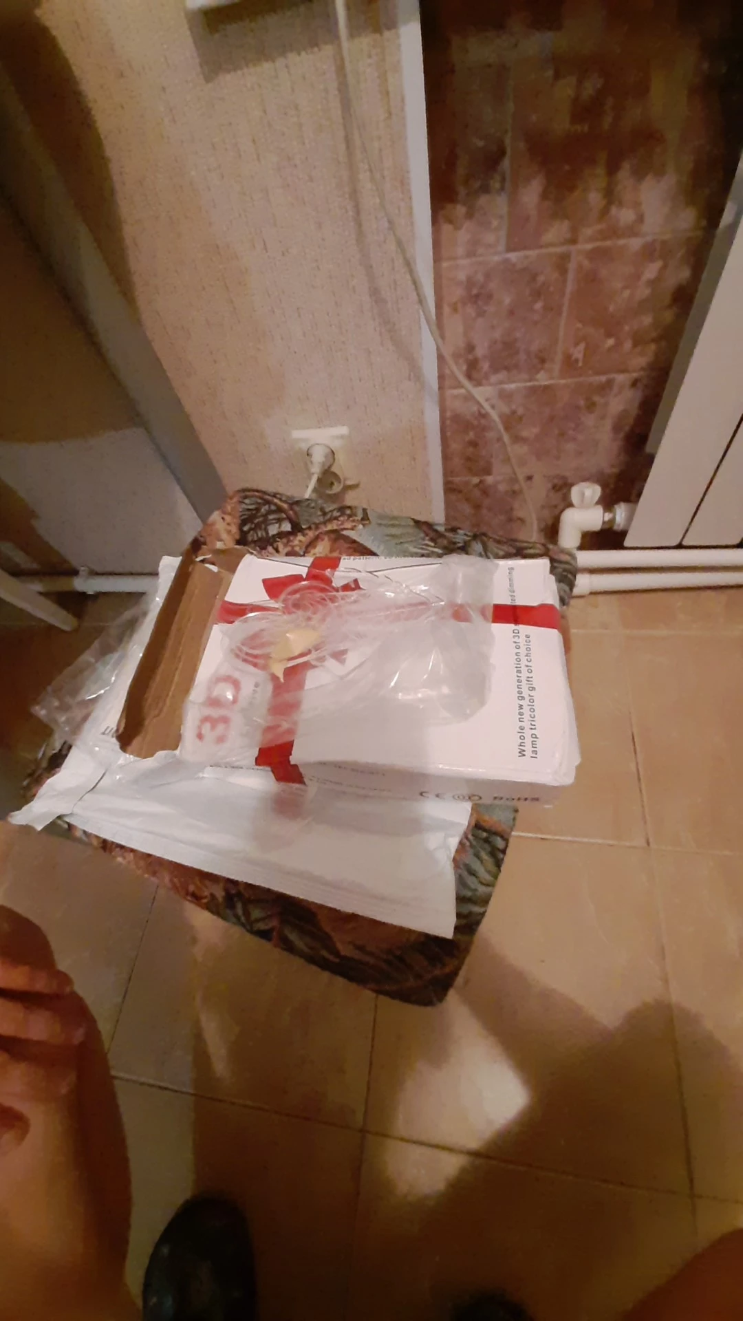 Коробка примята при доставке, стекло с картинкой не пострадало. Работает. Дома попробую в темноте. Жена хотела в качестве ночник.