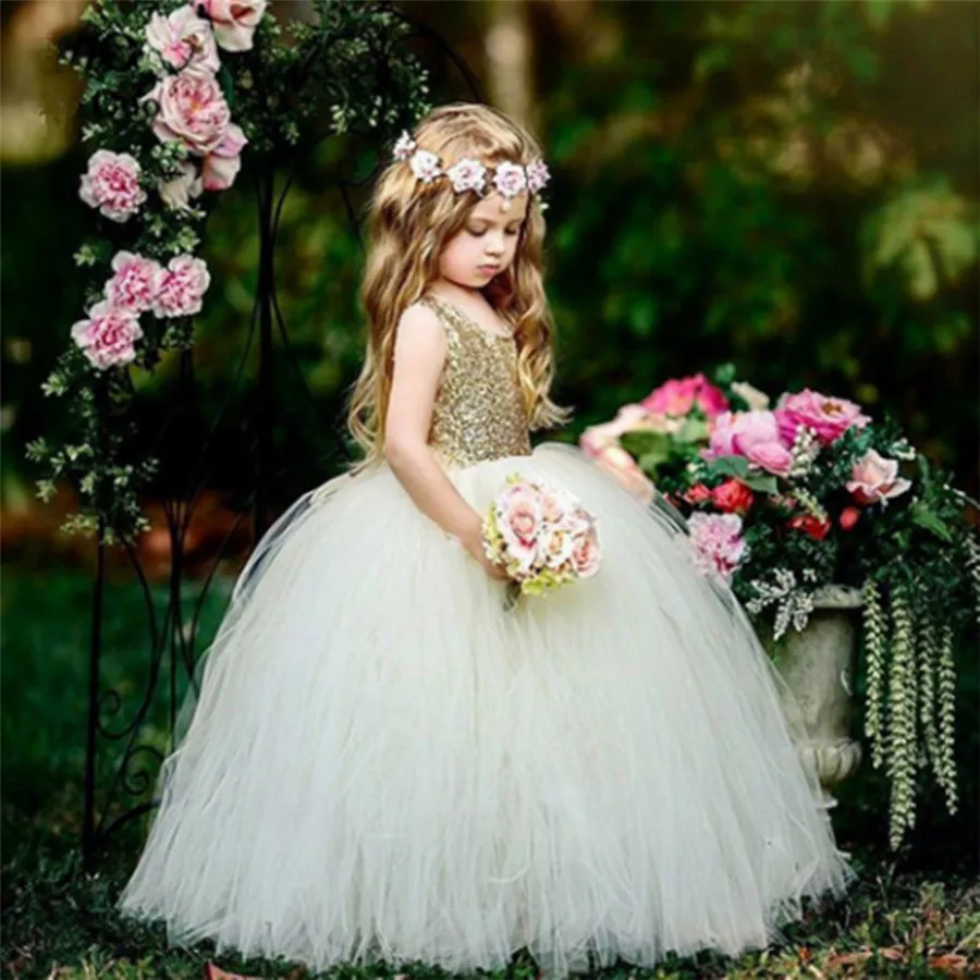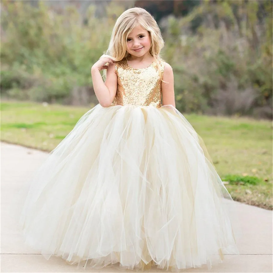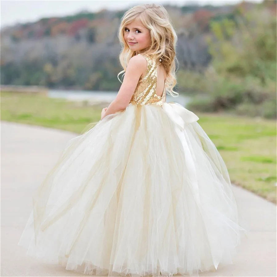 Блестящие платья для девочек с блестками и цветами, пушистые Бальные платья из тюля с открытой спиной и бантом, Детские платья для дня рождения и первого Дня Святого Причастия