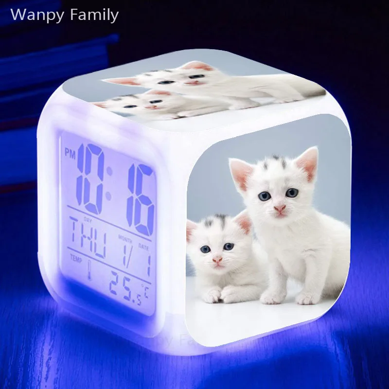 Милый белый Ktten, кот, светодиодный Будильник, 7 цветов, светящиес...