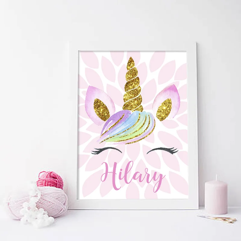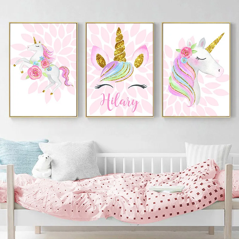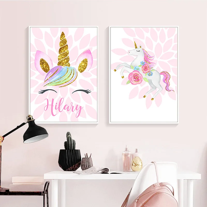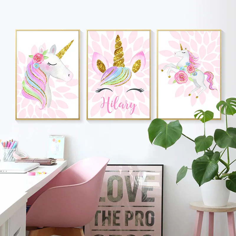 Мультяшные розовые постеры для детской комнаты с единорогом с именем на заказ настенная Художественная Картина на холсте красивые картины украшение детской комнаты