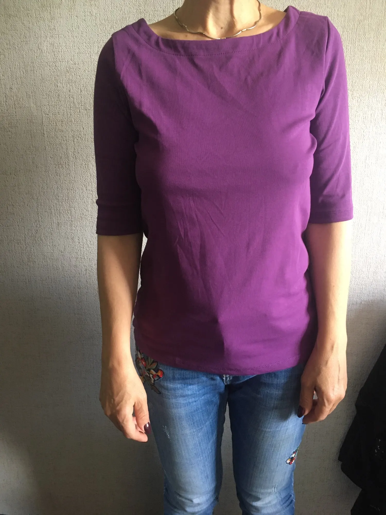 Материал приятный, цвет соответствует. Обратите внимание: рукава у этой футболки короче, чем на фотографиях продавца. На фотографиях продавца рукав три четверти. В действительности он до локтя. Мой рост 164 см, рукав обычно ношу 55 см, то есть руки немного коротковаты. И рукав этой футболки до локтя. На руки длиннее будет ещё короче. Размер подошёл на обхват груди 89 см и обхват талии 72 см. Качество в целом хорошее, уже брала такую футболку здесь.