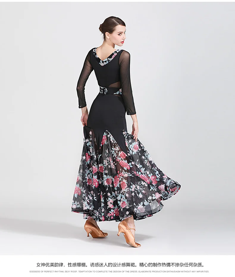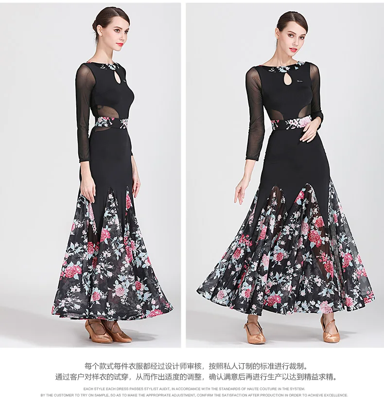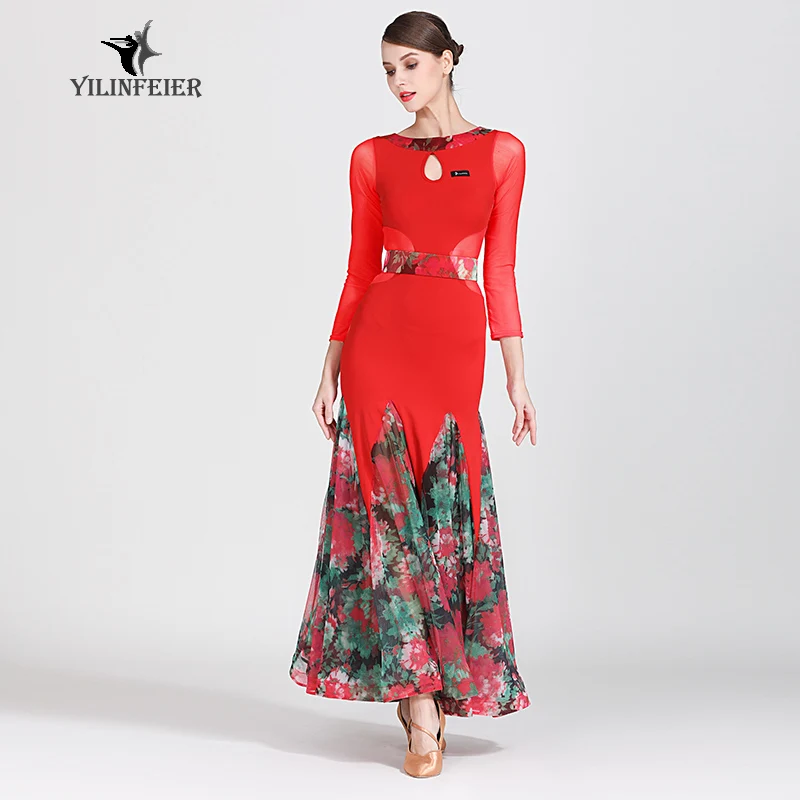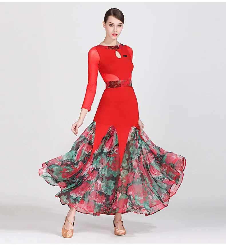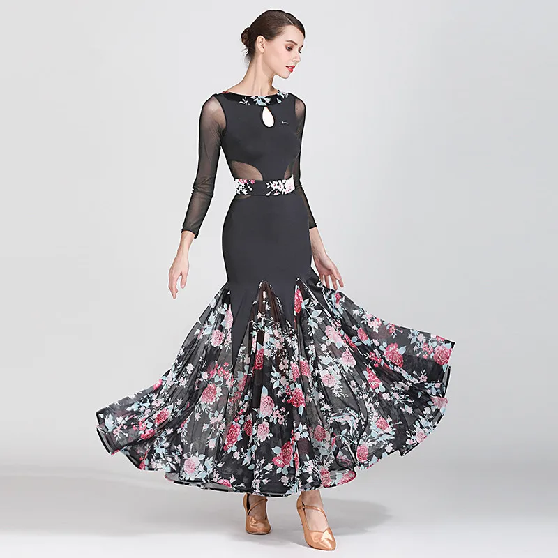 Костюм для современных танцев, женская одежда для бальных танцев, униформа для вальса и выступлений, одежда для бальных танцев, Сетчатое платье с принтом и большой юбкой, 1873